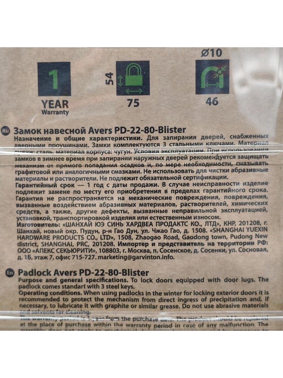 Замок навесной цилиндровый общего применения. Материал корпуса - чугун, покрыт полимерной краской. Закаленная стальная дужка диаметром 12 мм; проем дужки - 43 мм по высоте и 44 мм по ширине. Габариты замка - 80х108 мм. Комплектуется 3 английскими ключами.