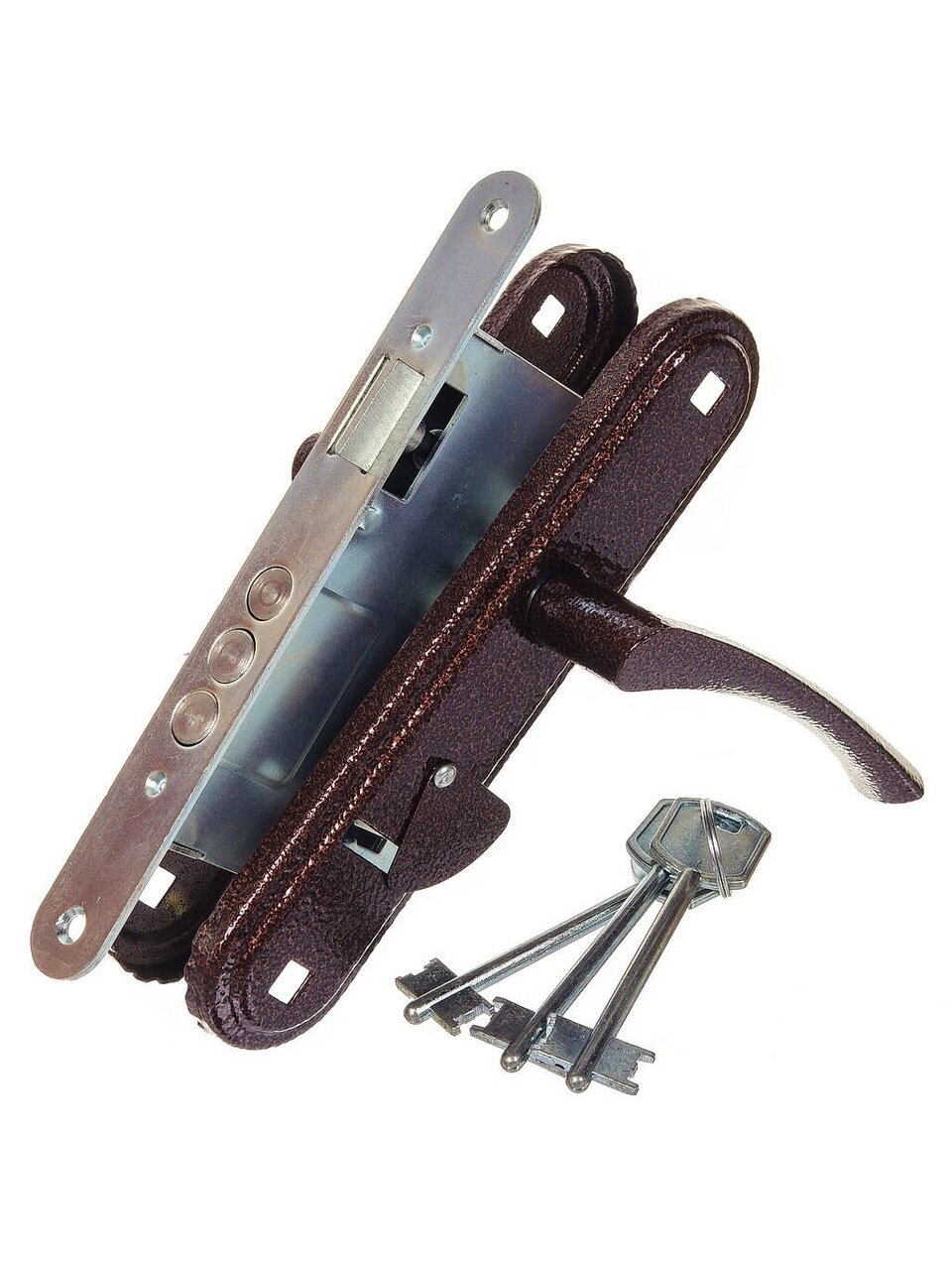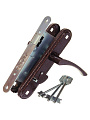 Замок врезной сувальдный универсальный с тремя стальными цилиндрическими ригелями диаметром 12 мм и защелкой класс 2 ГОСТ 5089-2011. Ручки-накладки покрыты полимерной краской. В ручки фалевые добавлены пружины и фиксаторы, что исключает «провисание» ручек и обеспечивает четкую фиксацию их положения.