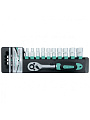 Изготовлены из высококачественной инструментальной стали. Предназначен для монтажа и демонтажа резьбовых соединений при обслуживании крупногабаритной техники. Корпус трещоточной рукоятки и торцевых головок выполнен из хромованадиевой стали с матовым хромированием покрытия. Рукоятка ключа изготовлена из двухкомпонентного материала. Набор состоит из 11 предметов, включая держатель для инструментов.