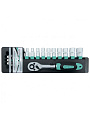 Изготовлены из высококачественной инструментальной стали. Предназначен для монтажа и демонтажа резьбовых соединений при обслуживании крупногабаритной техники. Корпус трещоточной рукоятки и торцевых головок выполнен из хромованадиевой стали с матовым хромированием покрытия. Рукоятка ключа изготовлена из двухкомпонентного материала. Набор состоит из 11 предметов, включая держатель для инструментов.