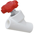 Полипропиленовый вентиль - корпусной фитинг с механизмом регулирования шпиндельного типа расположенного под углом 45 градусов к направлению потока, позволяет плавно регулировать его в системе. Вращение маховика против часовой стрелки открывает вентиль, а по часовой закрывает.