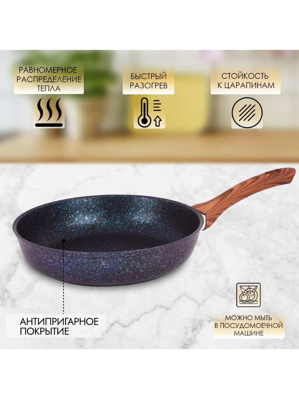 Да, антипригарное алмазное покрытие и литой алюминий позволяют безопасно мыть сковороду в посудомоечной машине — это экономит время и сохраняет внешний вид изделия.