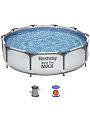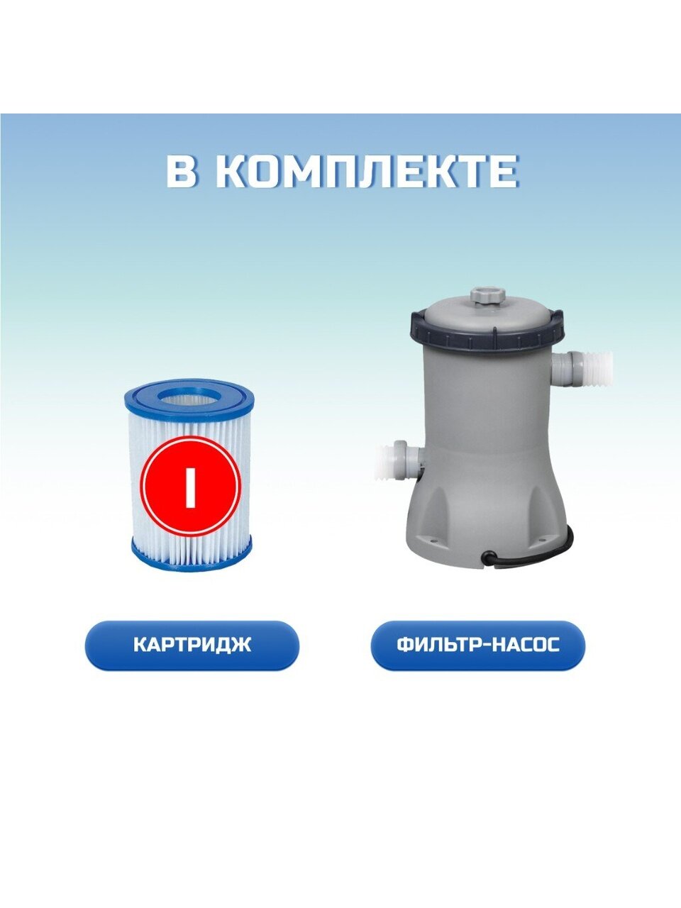 Комплектация: каркас - 1 шт; чаша бассейна - 1 шт; фильтрационный насос - 1 шт; картридж (тип I) - 1 шт; шланги и хомуты для подключения фильтр-насоса - 1 комплект; ремкомплект -1 шт; инструкция - 1 шт.