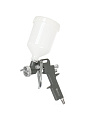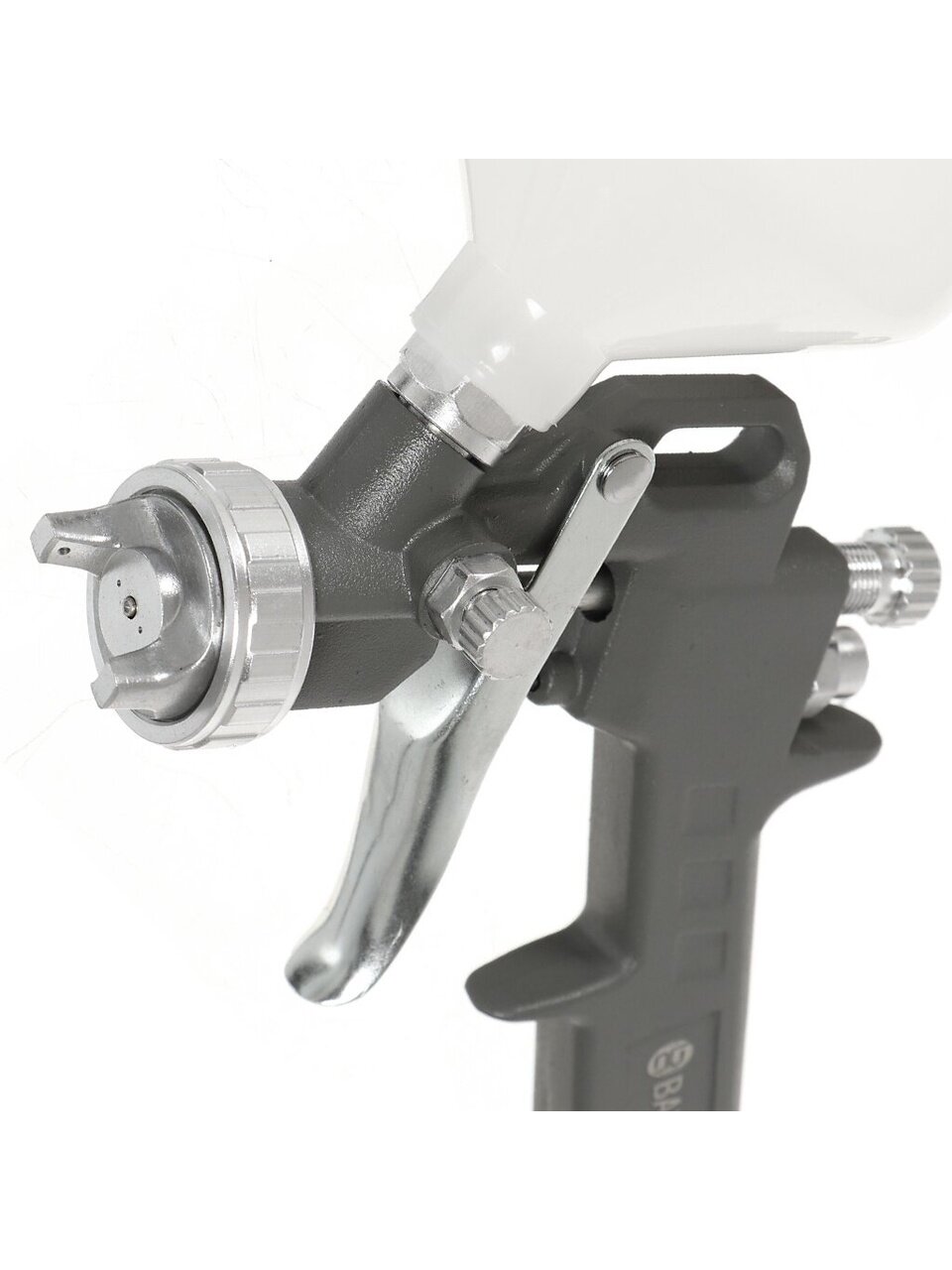 Краскораспылитель с верхним бачком 0.6 л – это устройство, предназначенное для быстрого окрашивания различных поверхностей одним нажатием кнопки, без малярных кистей и валиков. В бачок заливается краска, а сам краскопульт подключается к компрессору, через который подается сжатый воздух. Под напором краска проходит через сопло и равномерно распределяется по материалу. Максимальное давление 4 бар.