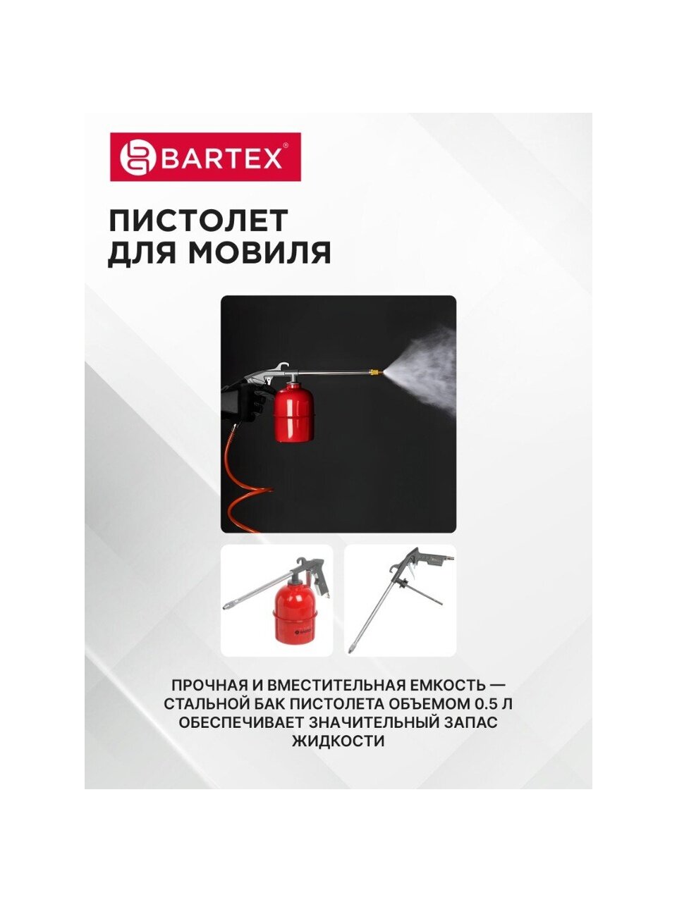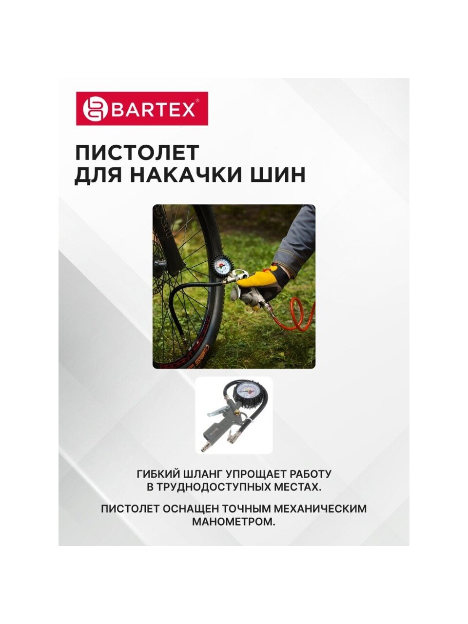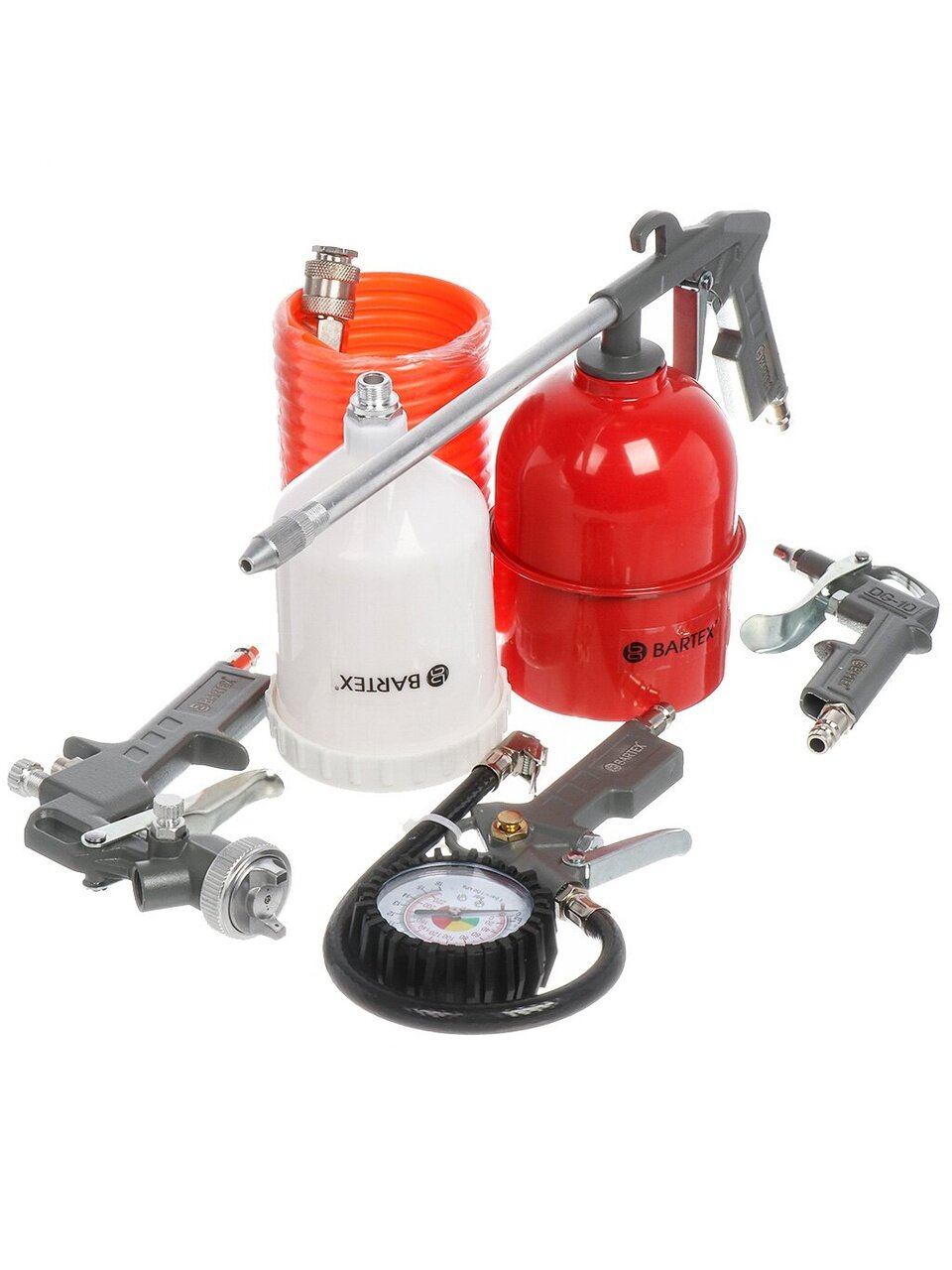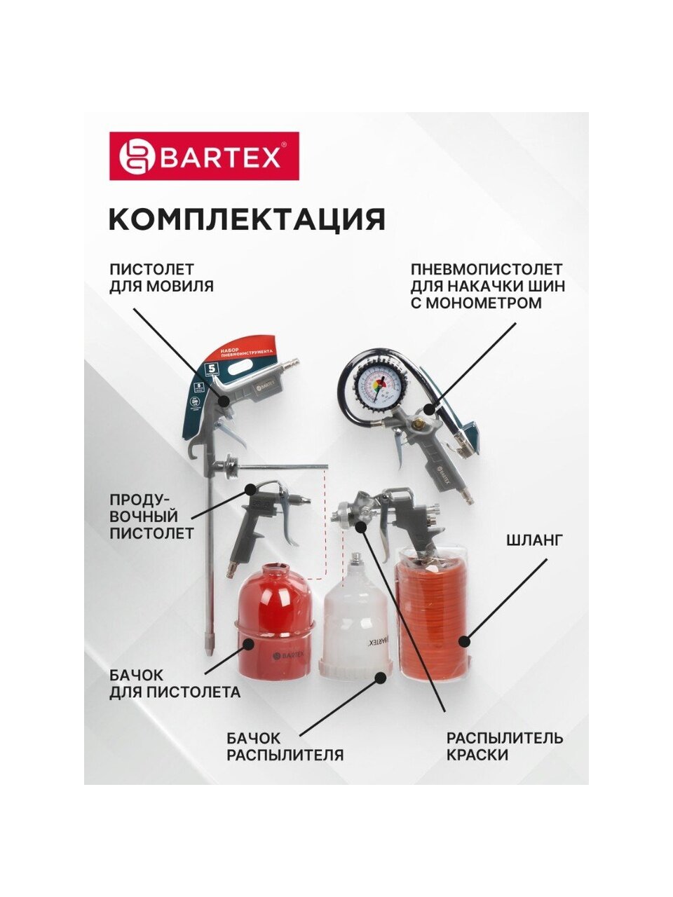 Набор Bartex – это отличный комплект, в котором есть все необходимое для работы с пневматикой. Он значительно сократит время ремонтных работ и улучшит их качество. С его помощью Вы без труда нанесете ровное лакокрасочное покрытие, подкачаете шины или избавитесь от нежелательного мусора в труднодоступных местах. Это не только нужный в каждом доме инструмент, но и отличная идея для подарка.