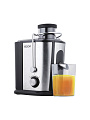 Центробежная соковыжималка в корпусе с отделкой нержавеющей сталью с широкой загрузочной горловиной для обработки целых плодов и резервуаром для сока емкостью 500 мл.