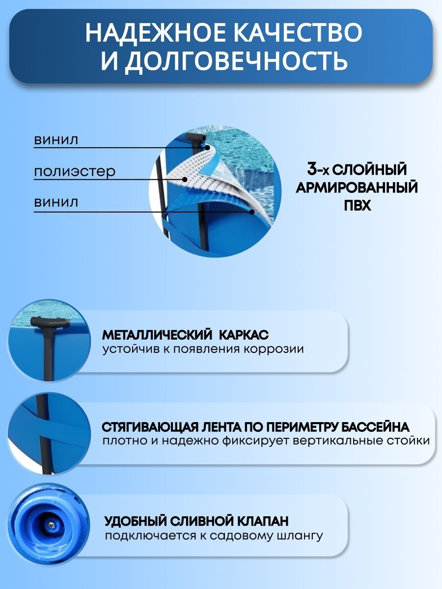Установка бассейна занимает всего 120 минут, а удобный сливной клапан облегчает процесс слива воды. В комплекте предусмотрена ремонтная заплатка, что позволяет быстро устранить мелкие повреждения. Бассейн рекомендуется разбирать на холодное время года, что способствует его сохранности и долговечности.