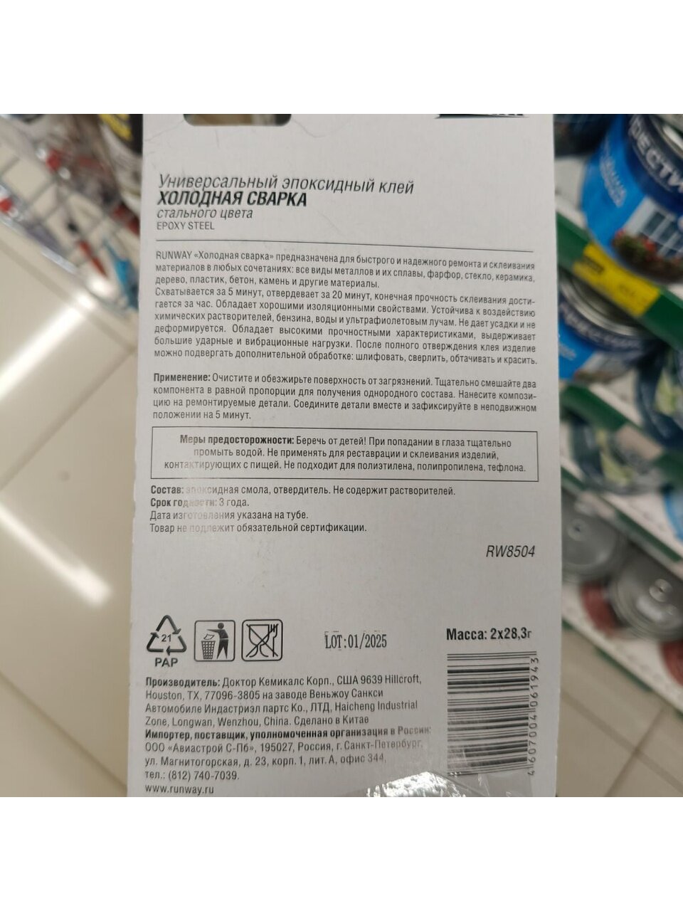 Универсальный эпоксидный клей Runway "Холодная сварка" предназначен для быстрого и надежного ремонта и склеивания материалов в любых сочетаниях: все виды металлов и их сплавы, фарфор, стекло, керамика, дерево, пластик, бетон, камень и другие материалы.