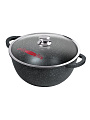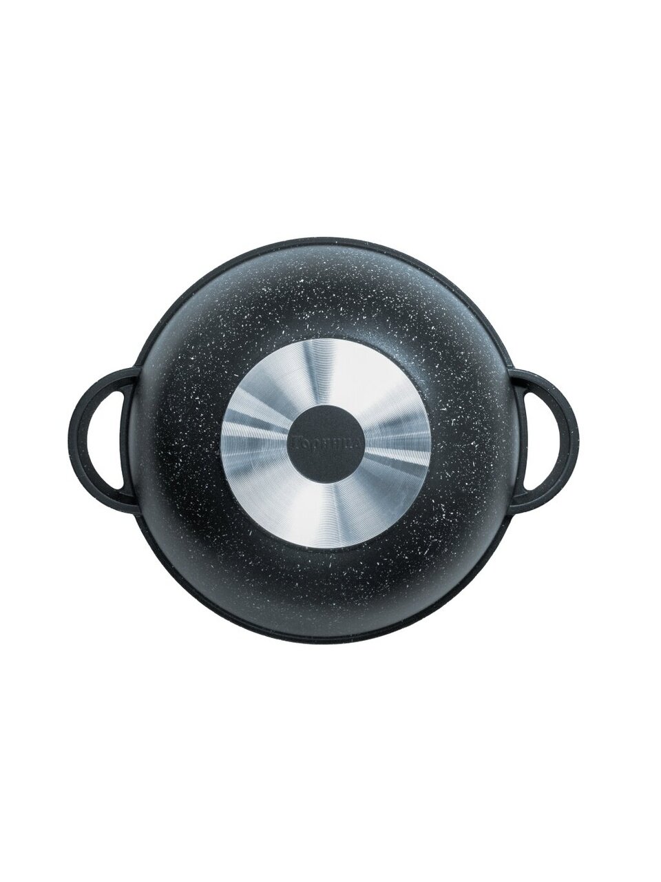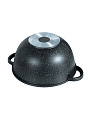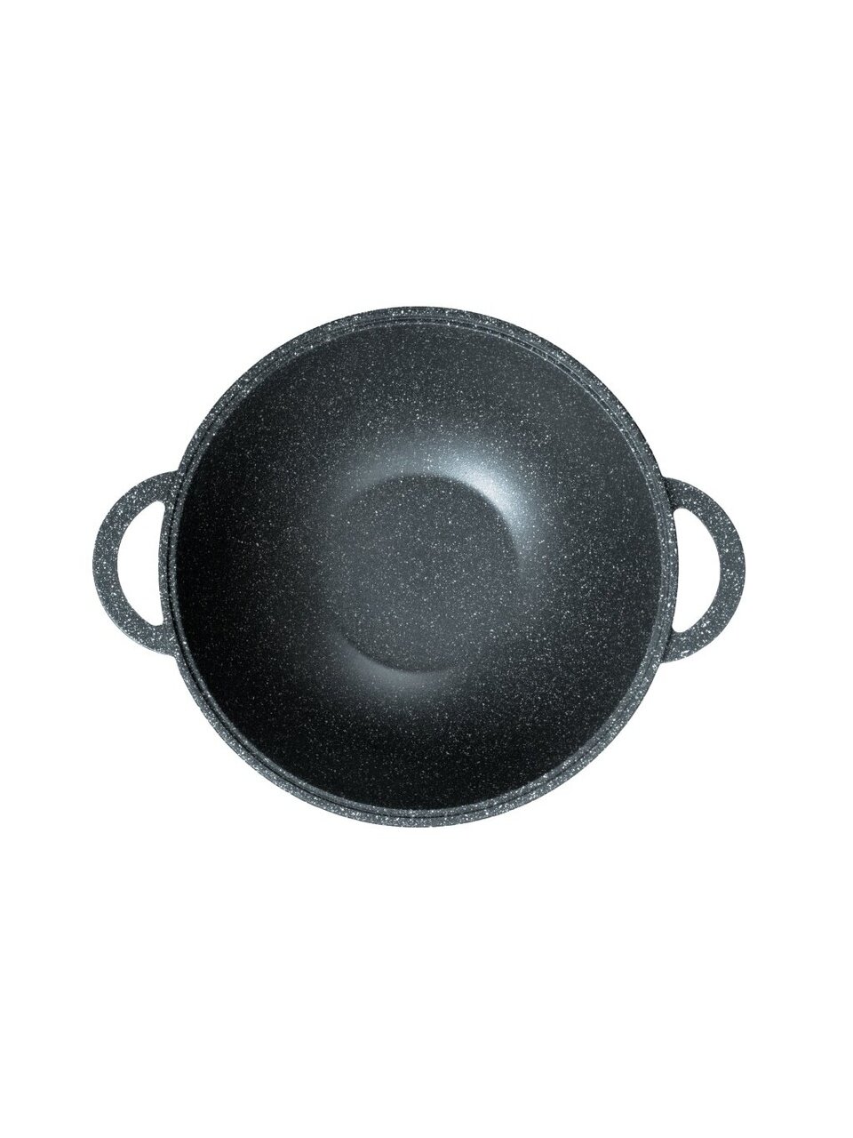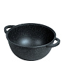 Литой алюминиевый казан с антипригарным покрытием подходит для газовых, электрических и стеклокерамических плит, а также для открытого огня. Казаны с цельнолитыми ручками можно использовать в духовом шкафу. Коллекция посуды «Гранит» с улучшенным четырехслойным антипригарным покрытием. Дополнительный слой с мраморным эффектом увеличивает износостойкость и создает оригинальный оттенок черного мрамора. Литой пищевой алюминий не имеет канцерогенных веществ и посторонних запахов. Толстые стенки и дно обеспечивают равномерное приготовление блюда.