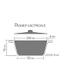 Объём — 4 литра, диаметр — 26 см, высота с крышкой — 18,5 см, вес — 2,1 кг. Кастрюля подходит для большинства стандартных конфорок и удобна для хранения.