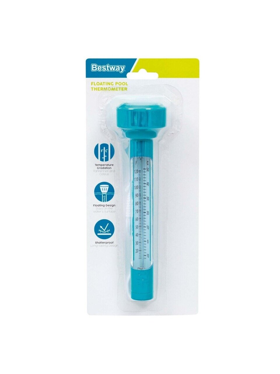 Термометр Bestway выполнен в нежном голубом цвете, который гармонично впишется в любой дизайн вашего бассейна. Он оснащен легко читаемой шкалой, отображающей температуру как в градусах Цельсия, так и в Фаренгейтах, что делает его удобным для пользователей с разными предпочтениями в измерительных системах. Диапазон температуры от 0 до +50 °С (+30 до +120F) позволяет использовать термометр в самых различных климатических условиях.