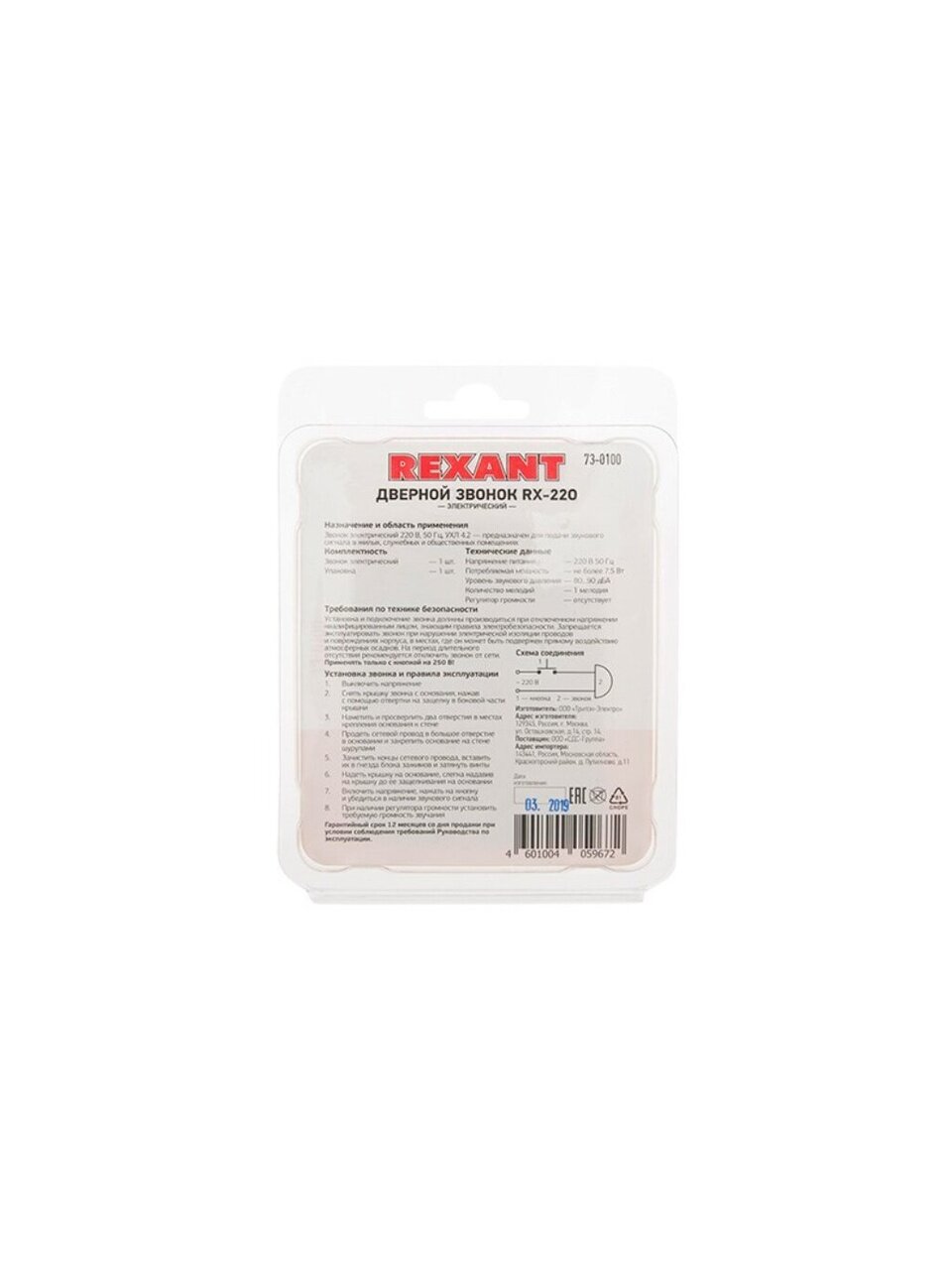 «Звонок дверной электрический, 220 Вт, Rexant, 73-0100» можно купить мелким, средним и крупным оптом по привлекательным ценам благодаря тому, что мы сотрудничаем с российскими и международными производителями напрямую, без посредников.