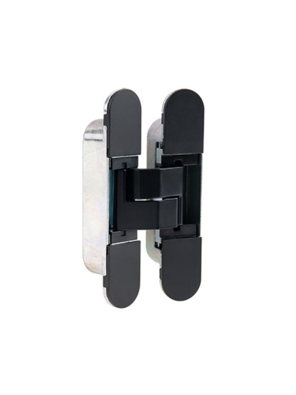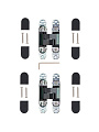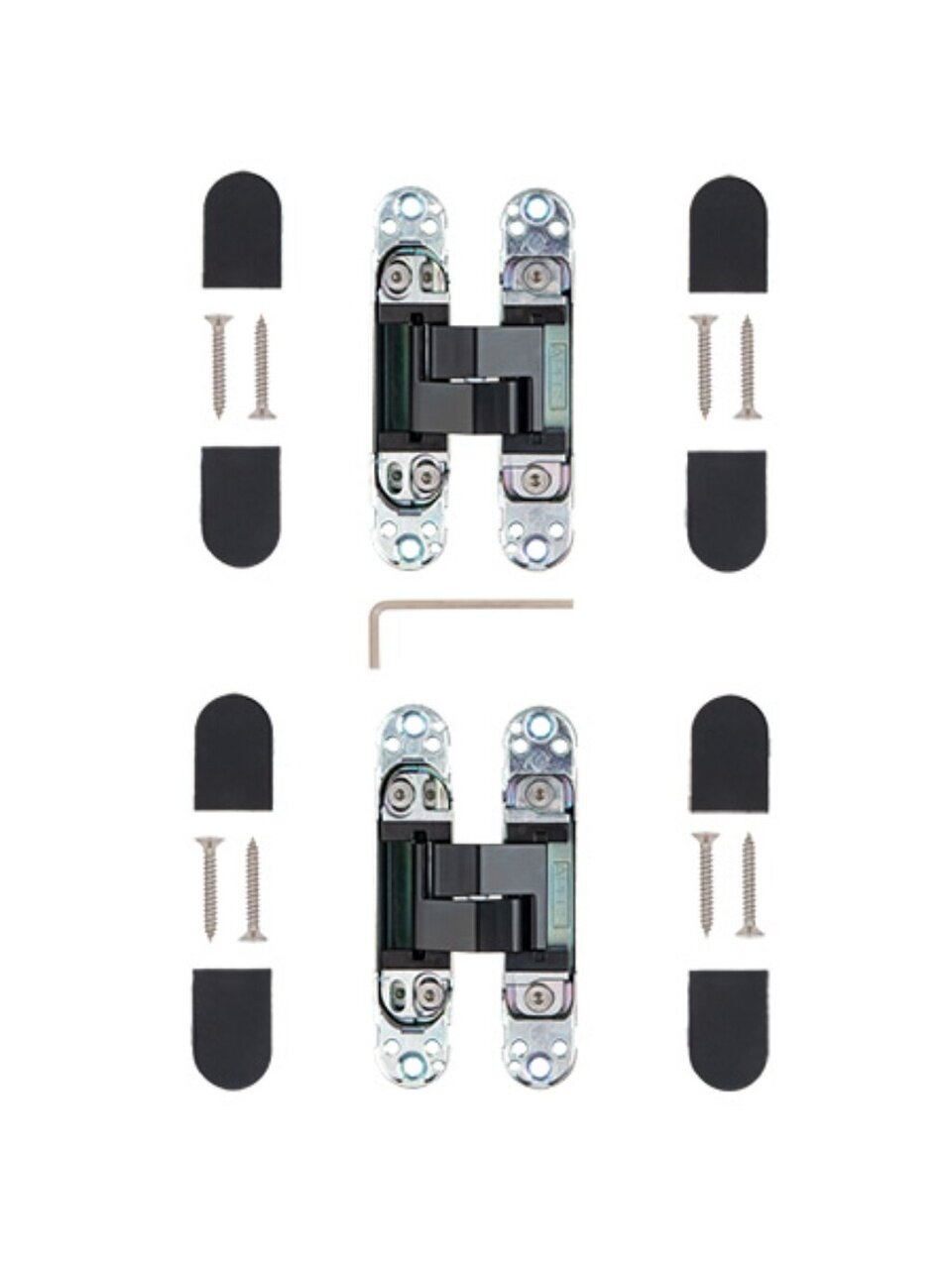 Универсальные врезные петли скрытой установки для левых и правых дверей. Работоспособность: 500 000 циклов. Регулируется в трёх плоскостях: по горизонтали ±1,5 мм, высоте ±2 мм и притвору ±1 мм. Нагрузка до 40 кг на две петли, до 60 кг на три петли. Декоративные накладки в комплекте.