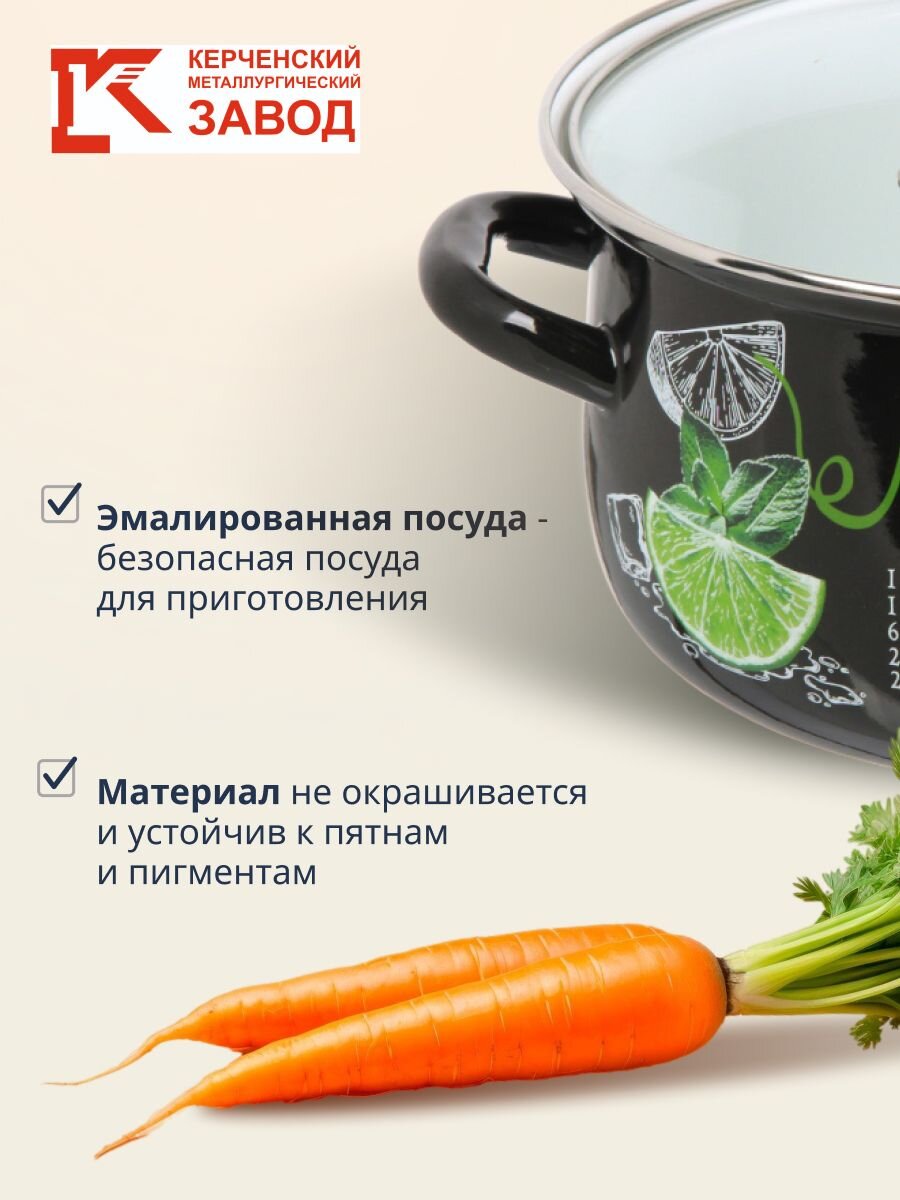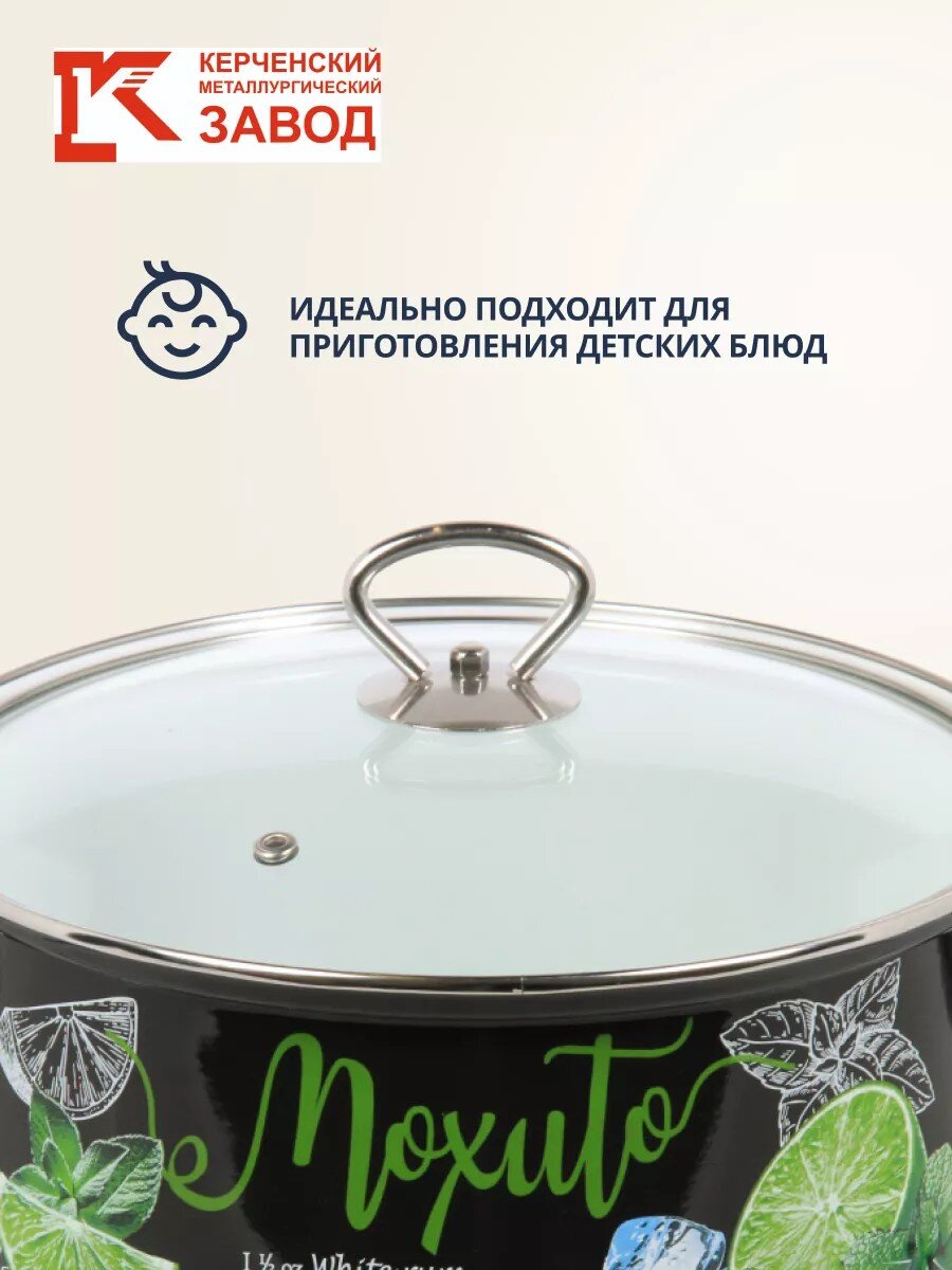 Кастрюля эмалированная 4 л Керченский металлургический завод «Мохито» — идеальный выбор для семьи: долговечная эмаль, стеклянная крышка, стильный декор, выгодная цена.
