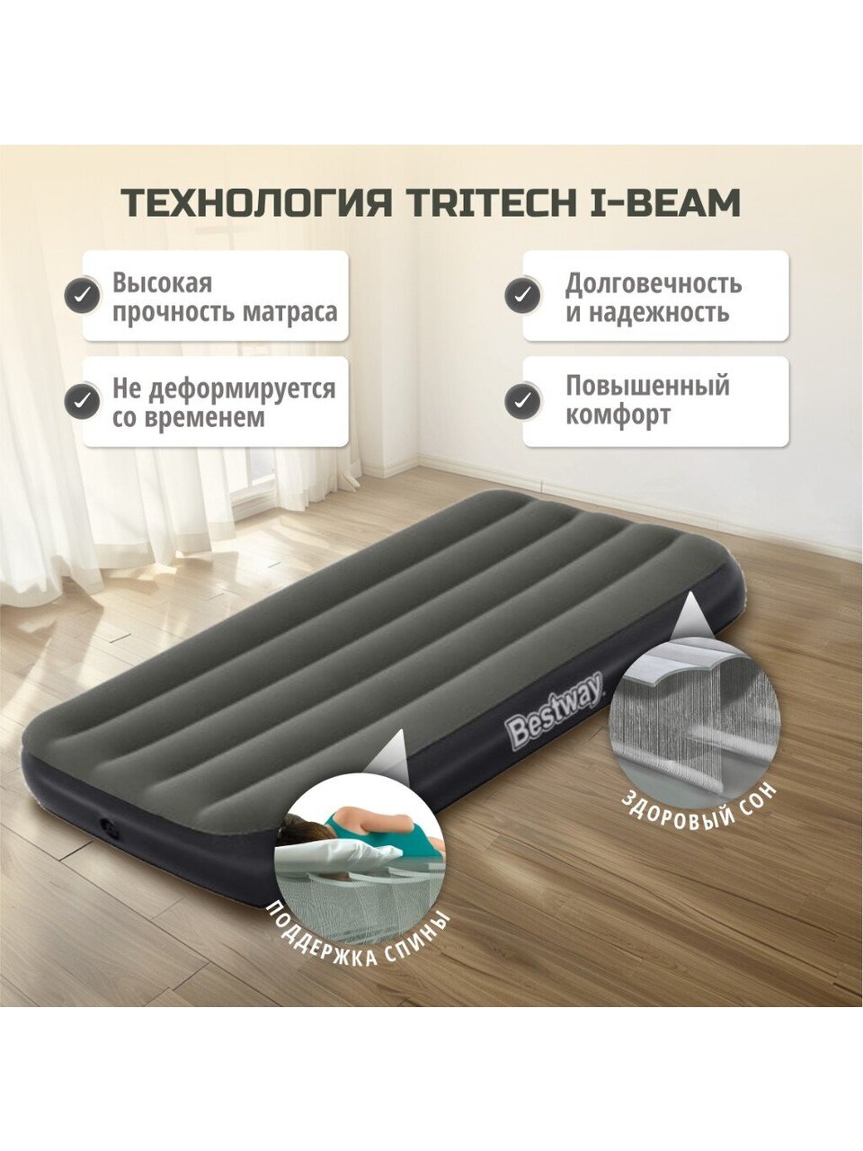 Матрас Bestway, выполненный из прочного флокированного винила, обеспечивает комфортный и здоровый сон в любых условиях. Его уникальная конструкция позволяет ему сохранять форму даже при неравномерном распределении нагрузки. Этот матрас легко надувать и сдувать, что делает его прекрасным выбором для путешествий или отдыха на природе. Кроме того, он может служить дополнительным спальным местом в квартире или доме. Если пространство ограничено, надувные матрасы становятся отличным решением для размещения гостей. Всё, что нужно сделать, - это надуть матрас и разместить его в свободной комнате.