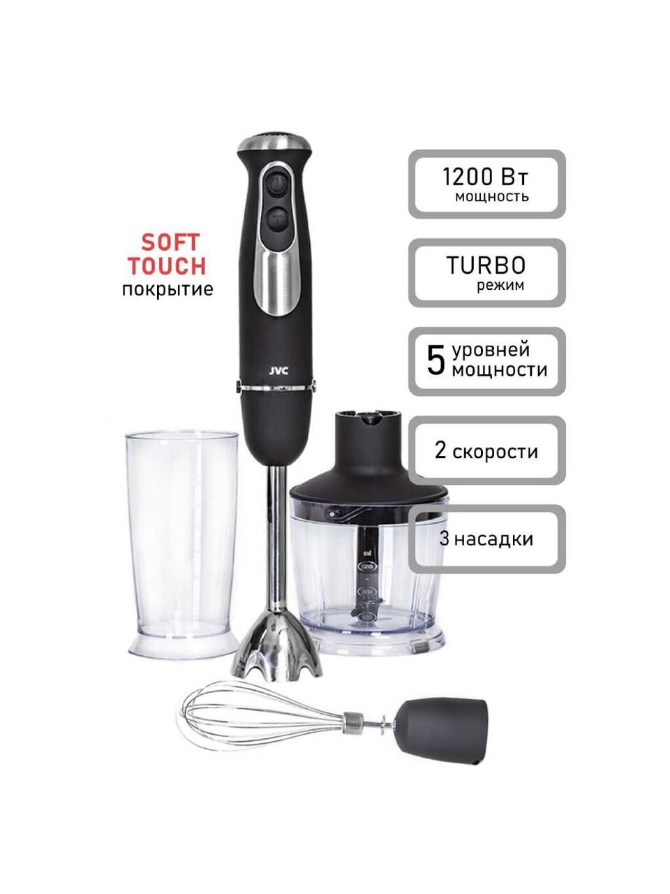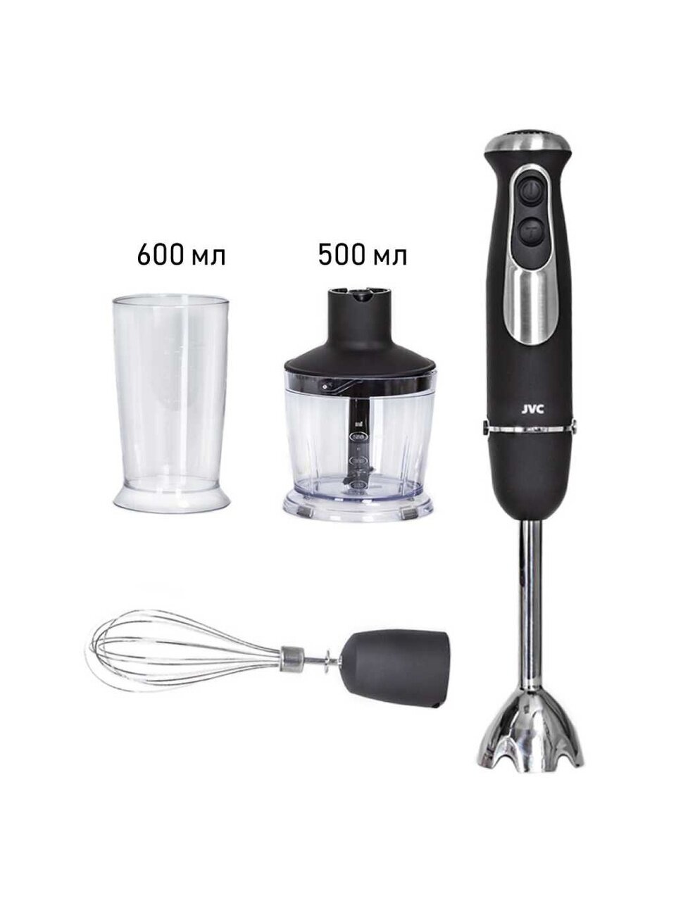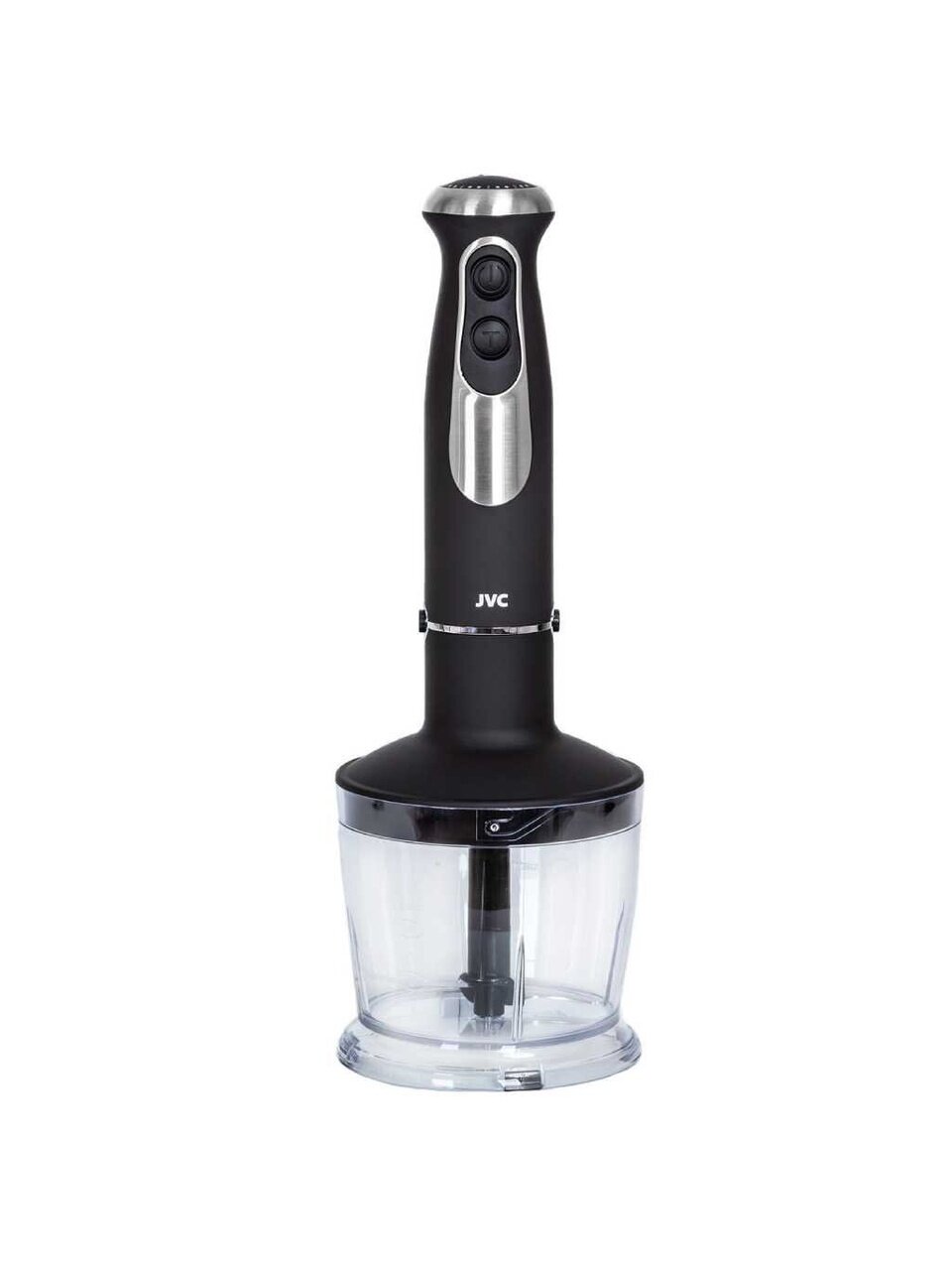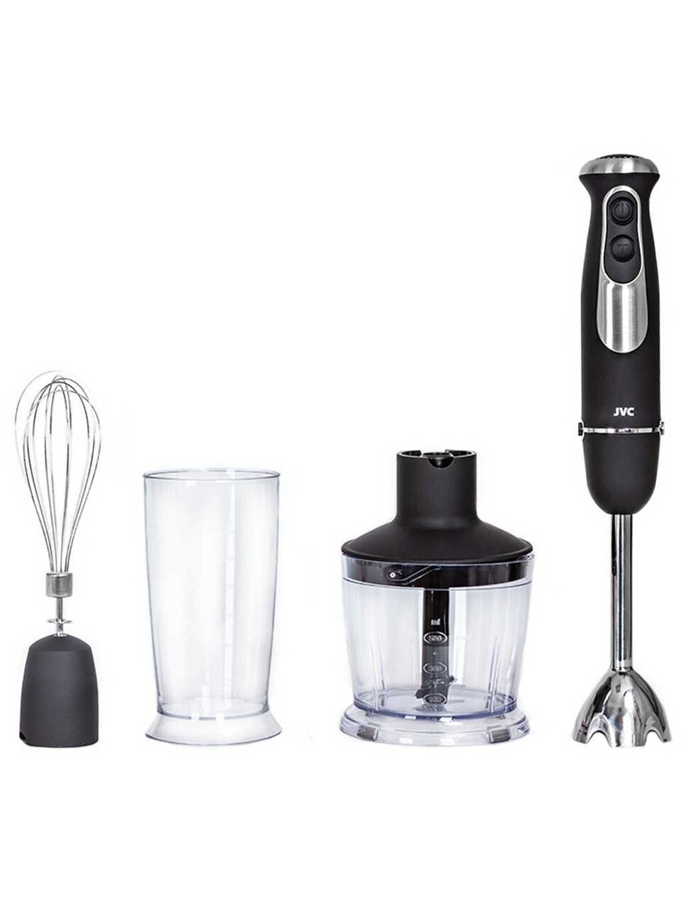 Многофункциональный погружной блендер JVC c измельчителем и 2 насадками поможет в приготовлении супов, соусов, выпечки и десертов, зимних заготовок и других ваших любимых блюд. Модель оснащена 5 уровнями мощности c плавной регулировкой, 2 скоростями и режимом Турбо. Материал погружной части съемных насадок и ножей измельчителя - качественная нержавеющая сталь.