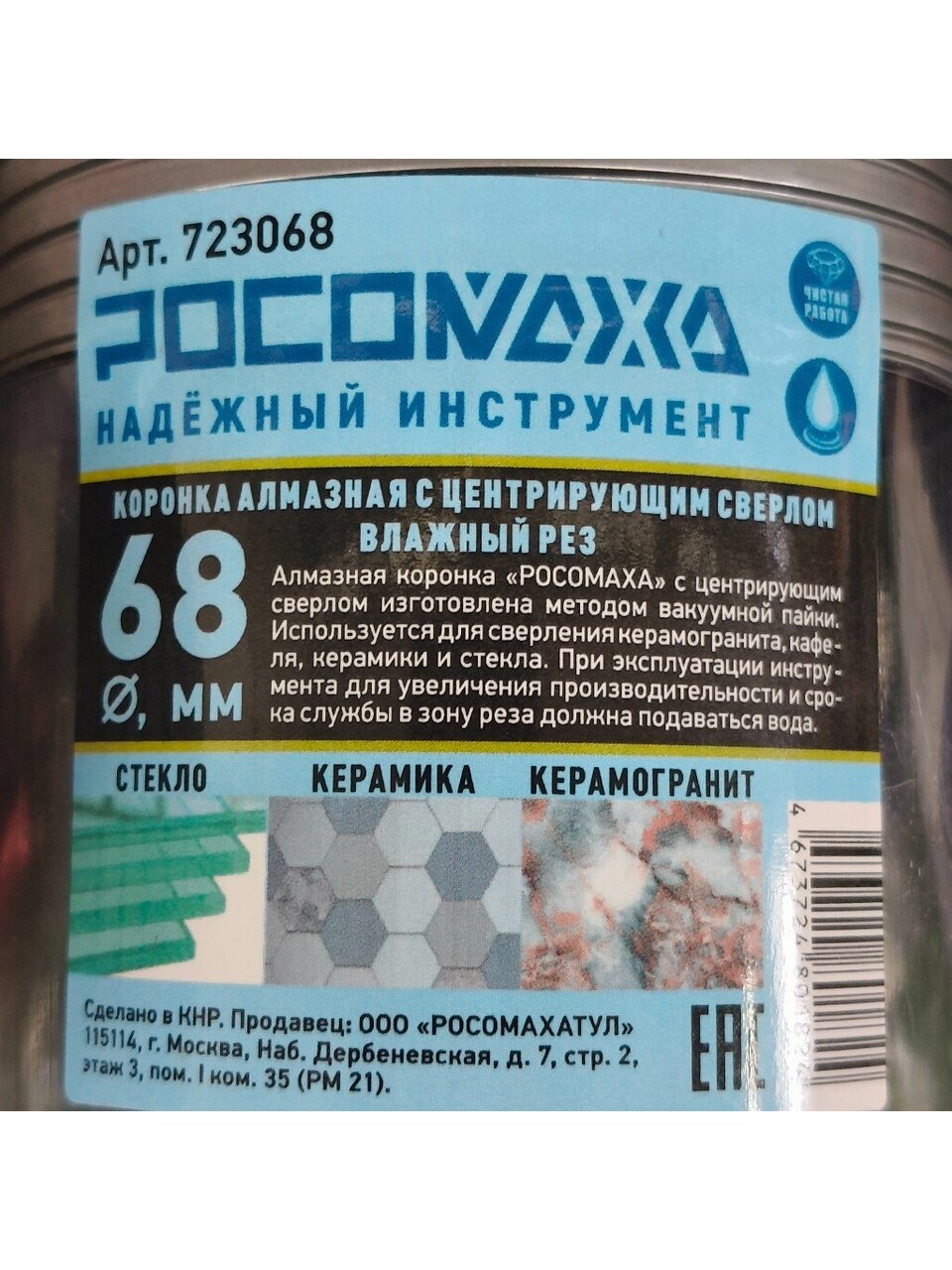 Коронка алмазная с центрирующим сверлом по керамограниту и керамике Росомаха изготовлена методом вакуумной пайки. Используется для сверления керамогранита, кафеля, керамики и стекла. При эксплуатации инструмента для увеличения производительности и срока службы в зону реза должна подаваться вода.