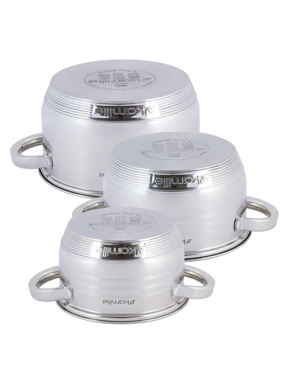 Набор кастрюль Kamille из нержавеющей стали на 6 предметов: универсальное решение для кухни, дачи и подарка. Подходит для индукции, объёмы 1.5/2/3 л, выгодная цена.