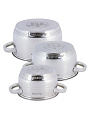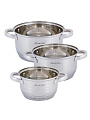 В комплекте три кастрюли объёмом 1.5, 2 и 3 литра. Подходят для приготовления первых и вторых блюд, соусов, заготовок и стерилизации банок.