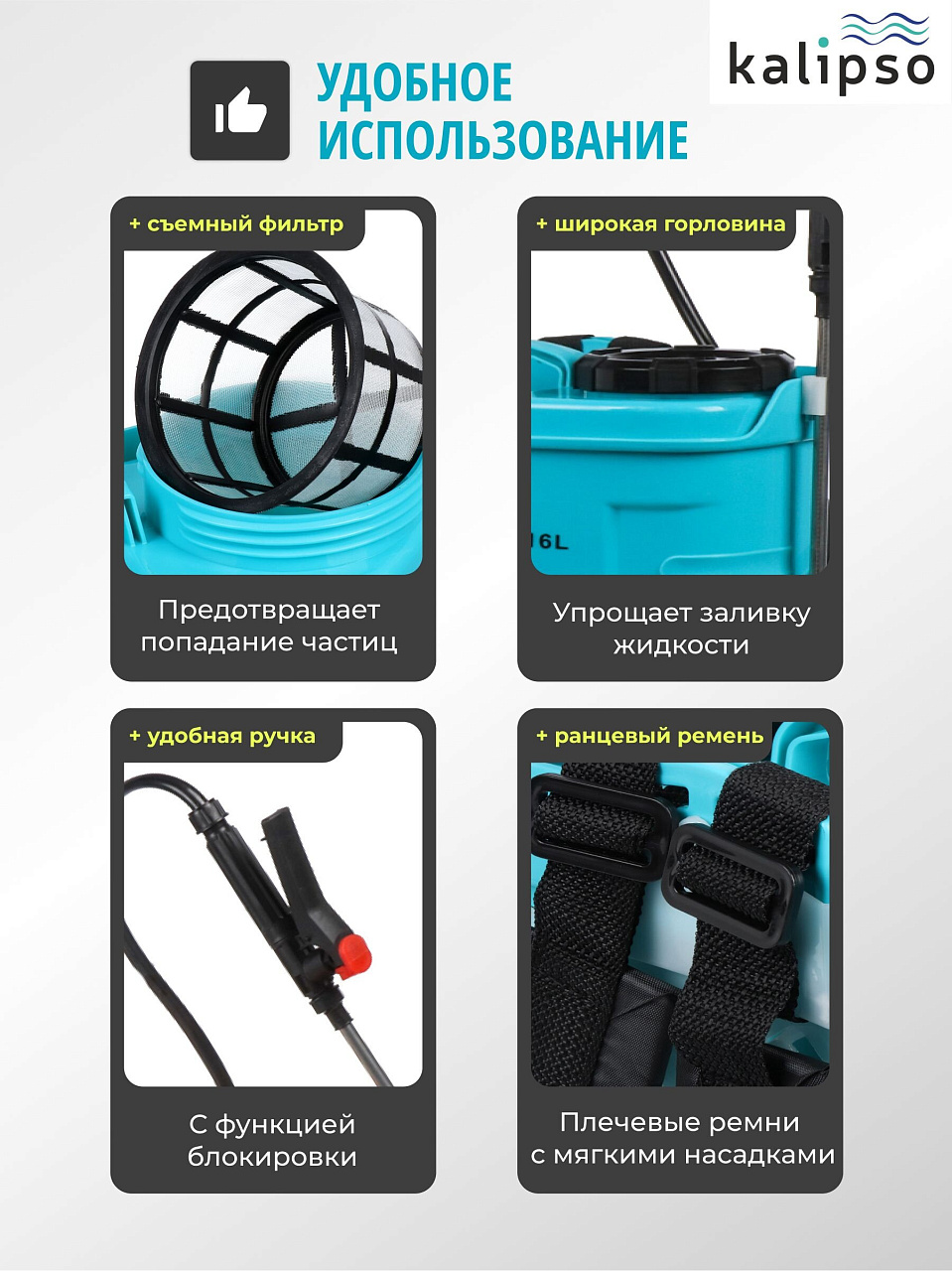 Аккумуляторный опрыскиватель не требует физического напряжения для создания давления в баке. Это позволяет снизить нагрузку на руки и спину, что особенно важно при длительных работах.