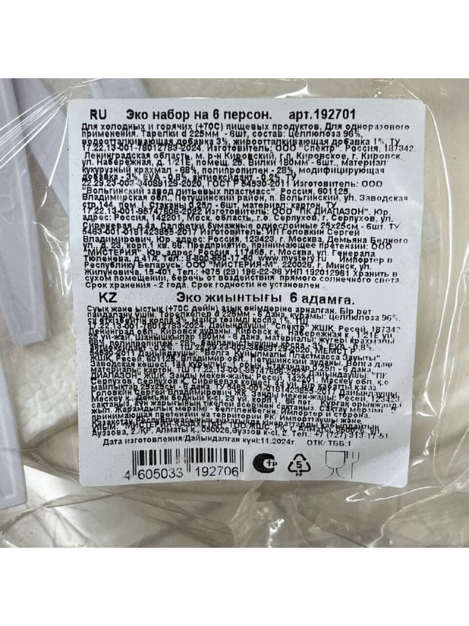 Составляющие набора: 6 персон, вилки (материал: кукурузный крахмал), стаканы 250мл (материал: картон), тарелки сахарный тростник, салфетки.