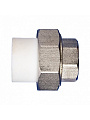 Диаметр подключения — 20 мм, внутренняя резьба 1/2 дюйма, тип присоединения — резьба-пайка, материал — полипропилен с латунной вставкой.