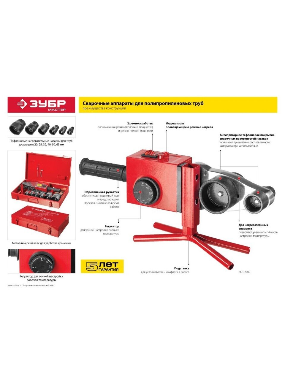 Выбрав для работы самый мощный сварочный аппарат Зубр АСТ2000, вы значительно ускорите и улучшите процесс сварки полипропиленовых труб и фитингов, благодаря его высокой производительности. Это позволит быстрее подготовить аппарат к работе и начать, значительно сокращая время выполнения задач. С Зубр АСТ2000 вы сможете более эффективно выполнять сварочные работы и достигать профессиональных результатов за минимальное время.
