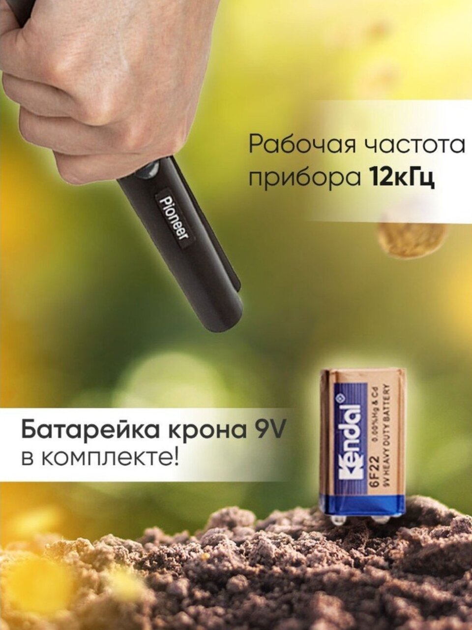 Металлоискатель работает на обычных батарейках типа 9V, и если они разрядятся, вы всегда сможете заменить их.