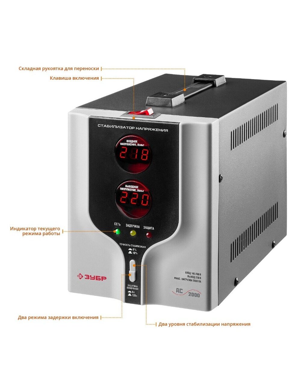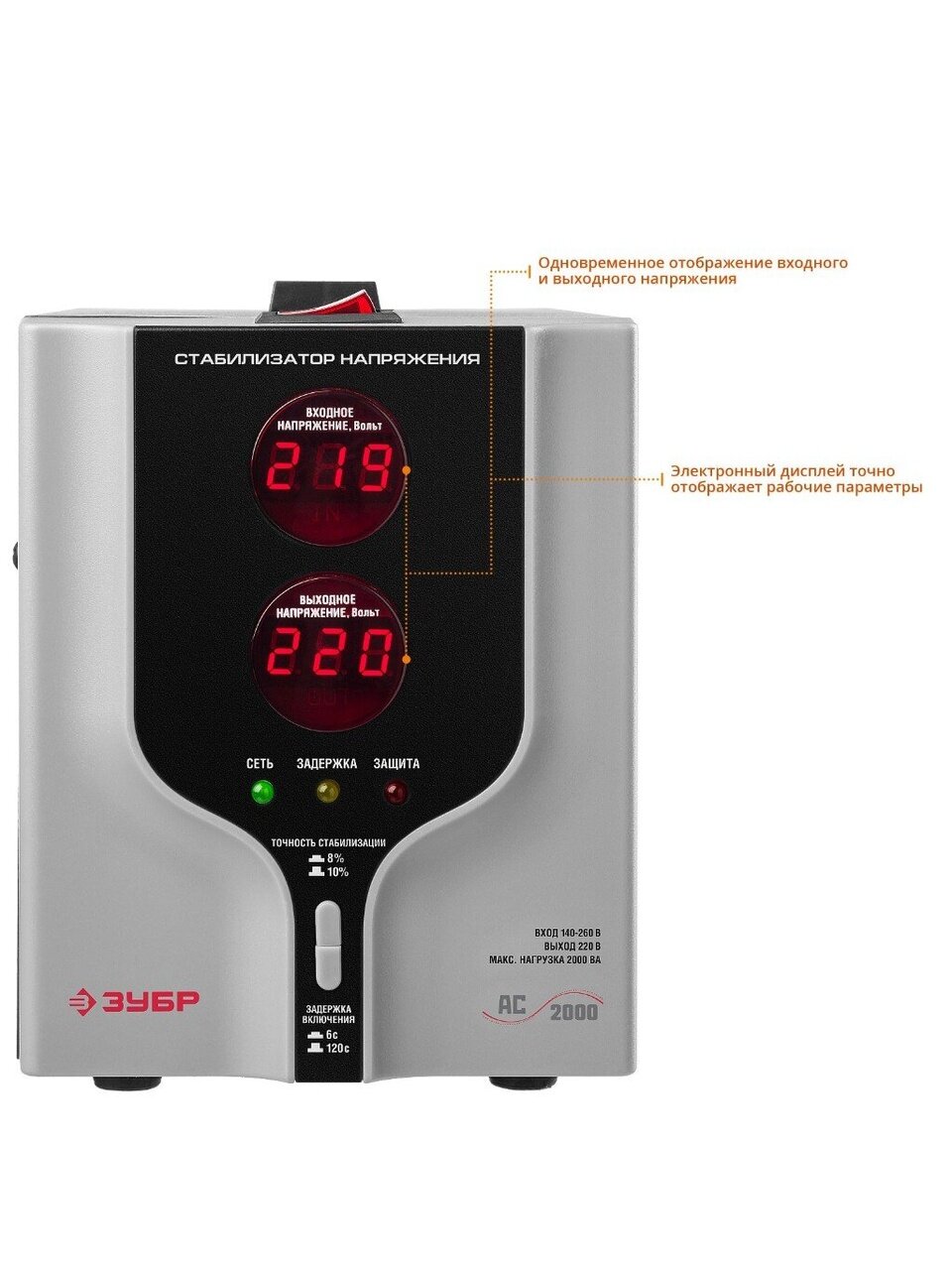 Защита от перегрузки: стабилизатор автоматически отключает питание, чтобы предотвратить повреждение устройства и подключенных к нему приборов.