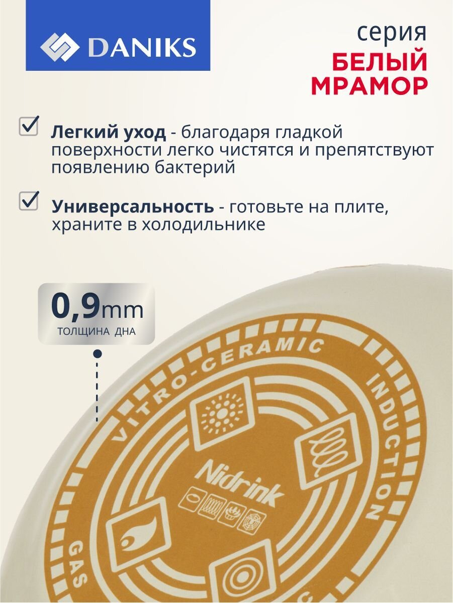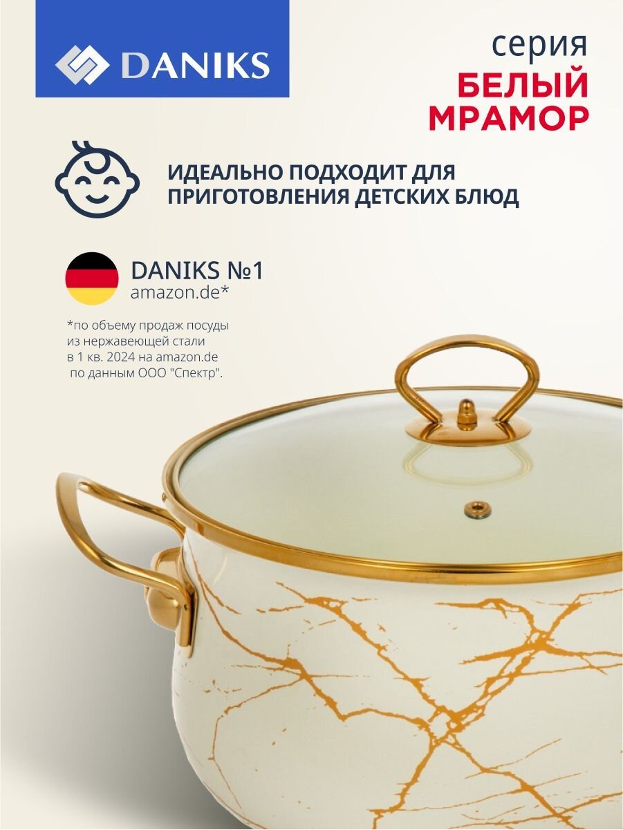 Кастрюля Daniks «Белый мрамор», 2.5 л: стильная эмалированная сталь для индукции и любых плит. Решение для здорового питания без лишних хлопот.