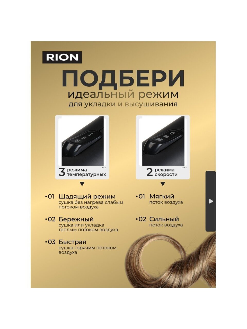 Покупка фена Rion, TC-2849, принесет выгоду в виде экономии времени и усилий на укладку волос, а также обеспечит профессиональный уход в домашних условиях. Этот инструмент станет надежным помощником для создания разнообразных образов, от повседневных до праздничных, даря уверенность и стиль каждый день.