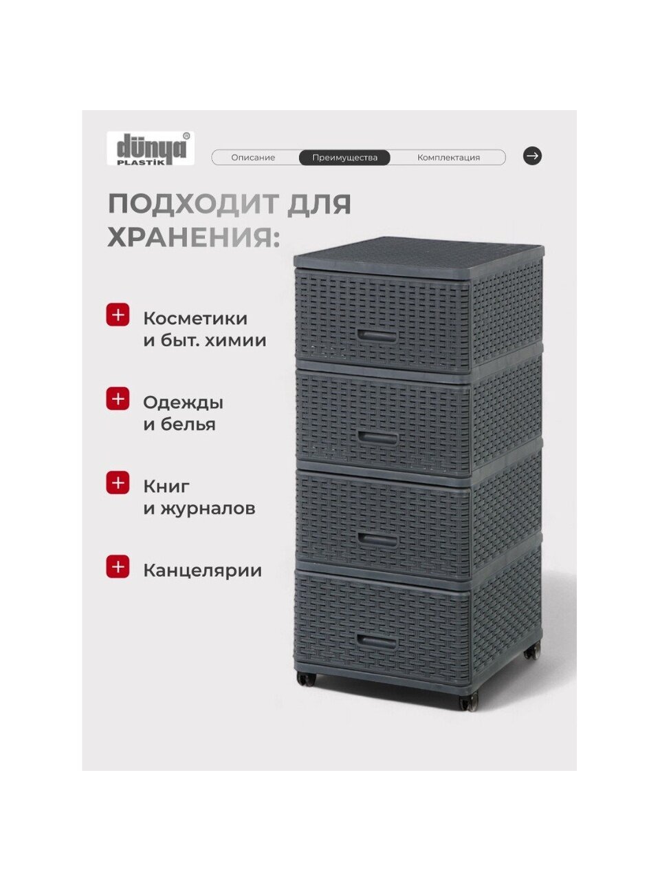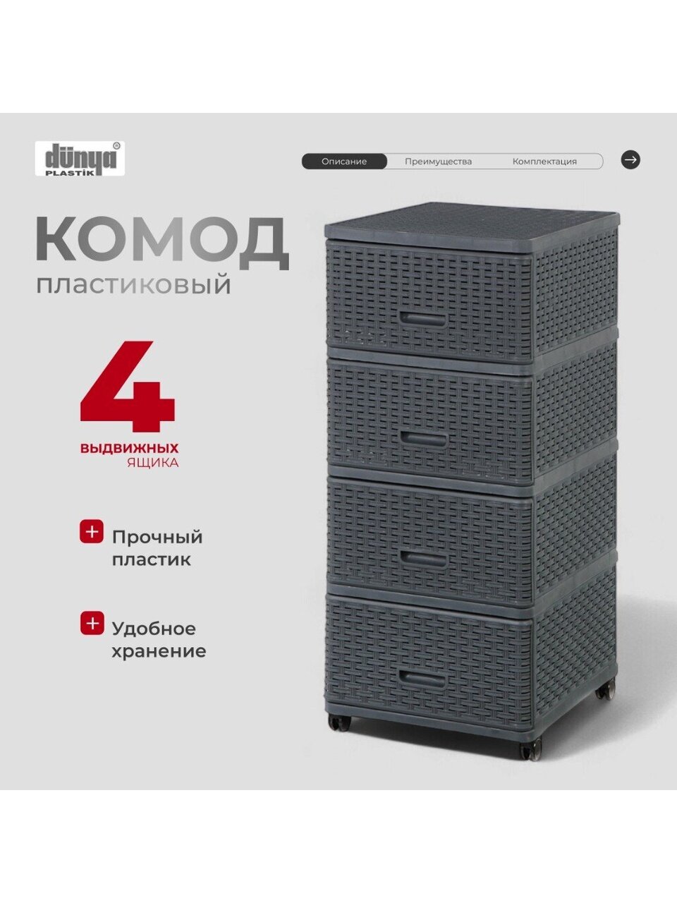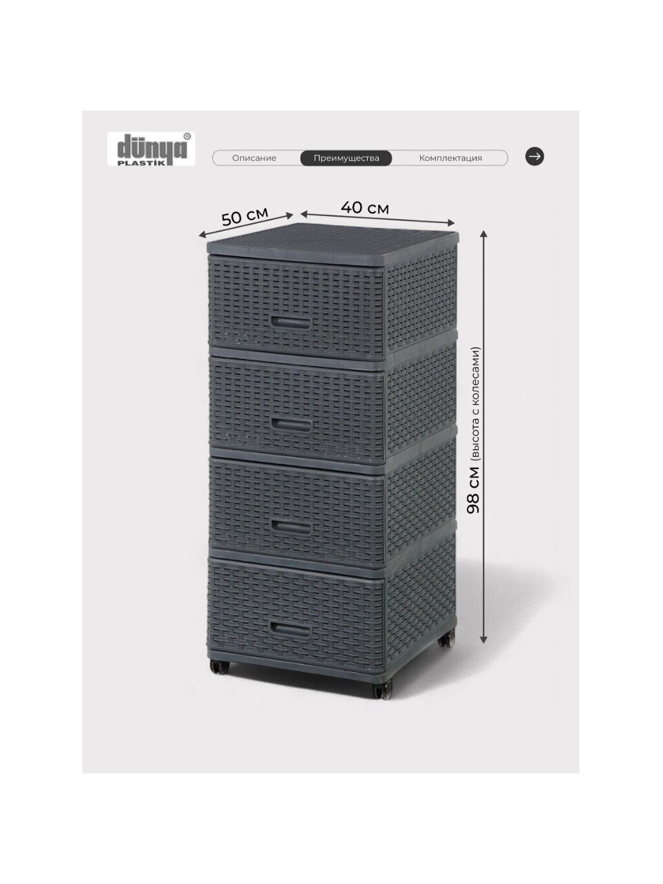 С помощью четырех вместительных ящиков можно легко организовать хранение вещей, будь то одежда, аксессуары или бытовые мелочи. Размеры комода — 40х50х98 см — позволяют разместить его даже в небольших помещениях, экономя драгоценное пространство. Комод оснащен полозьями, что обеспечивает плавное и бесшумное выдвижение ящиков, а наличие колес делает его мобильным и удобным в использовании.