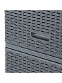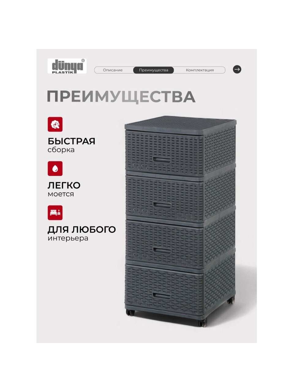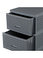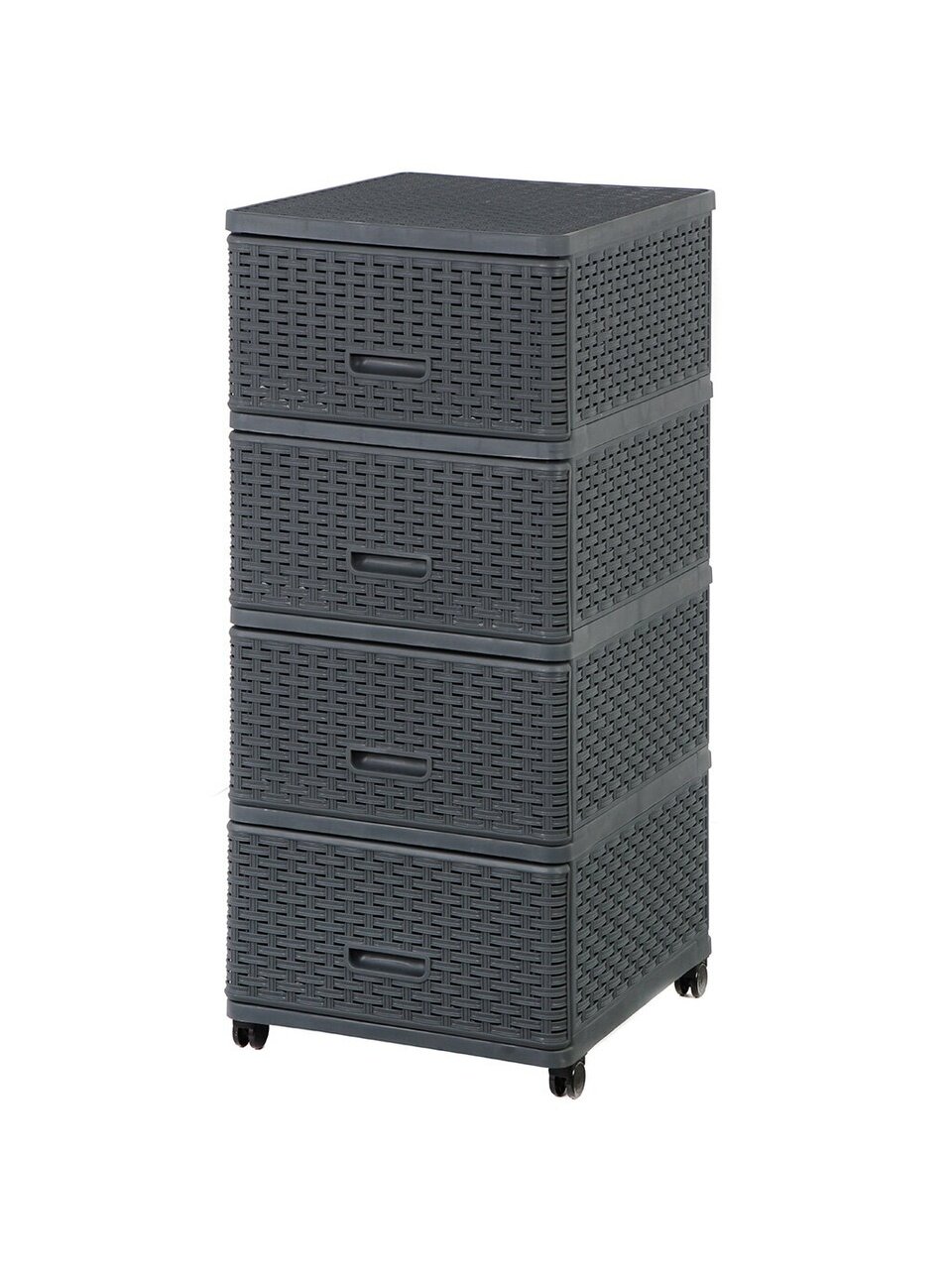 Комод "Дюна" выполнен в элегантном цвете антрацит, который гармонично впишется в любой интерьер. Плетеная текстура придает изделию особый шарм и утонченность, создавая впечатление легкости и воздушности. Высококачественный пластик, из которого изготовлен корпус и фасад комода, гарантирует долговечность и простоту в уходе.