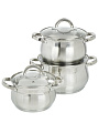 В наборе три кастрюли: 2.1, 2.9 и 3.9 литра. Это позволяет выбрать оптимальный размер для приготовления различных блюд — от гарниров до супов и вторых блюд.