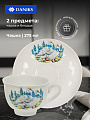 Комплект рассчитан на одного человека, включает чашку объёмом 275 мл и блюдце круглой формы, поставляется в индивидуальной упаковке без подарочной коробки.