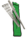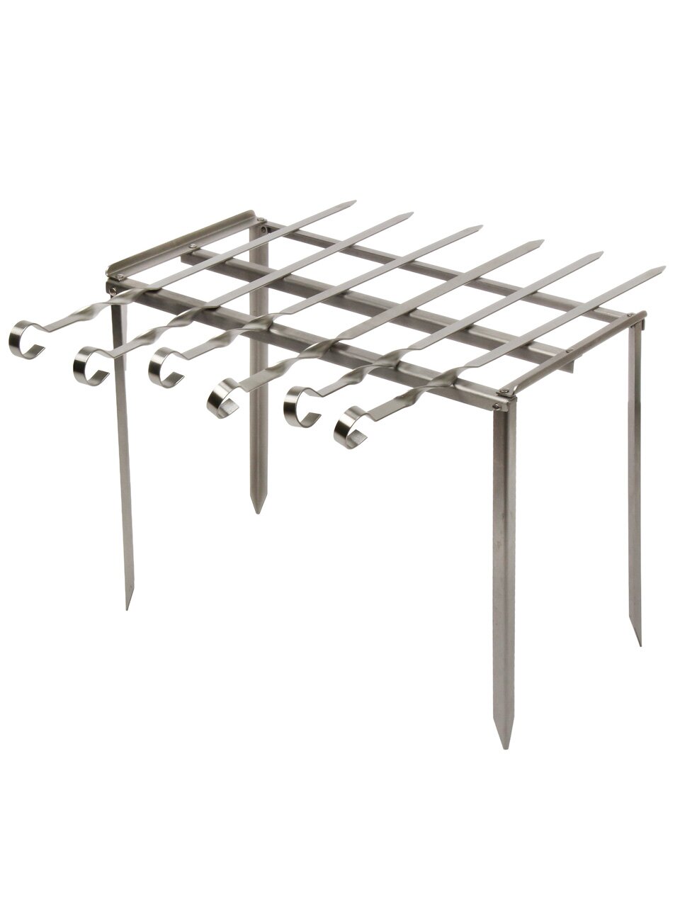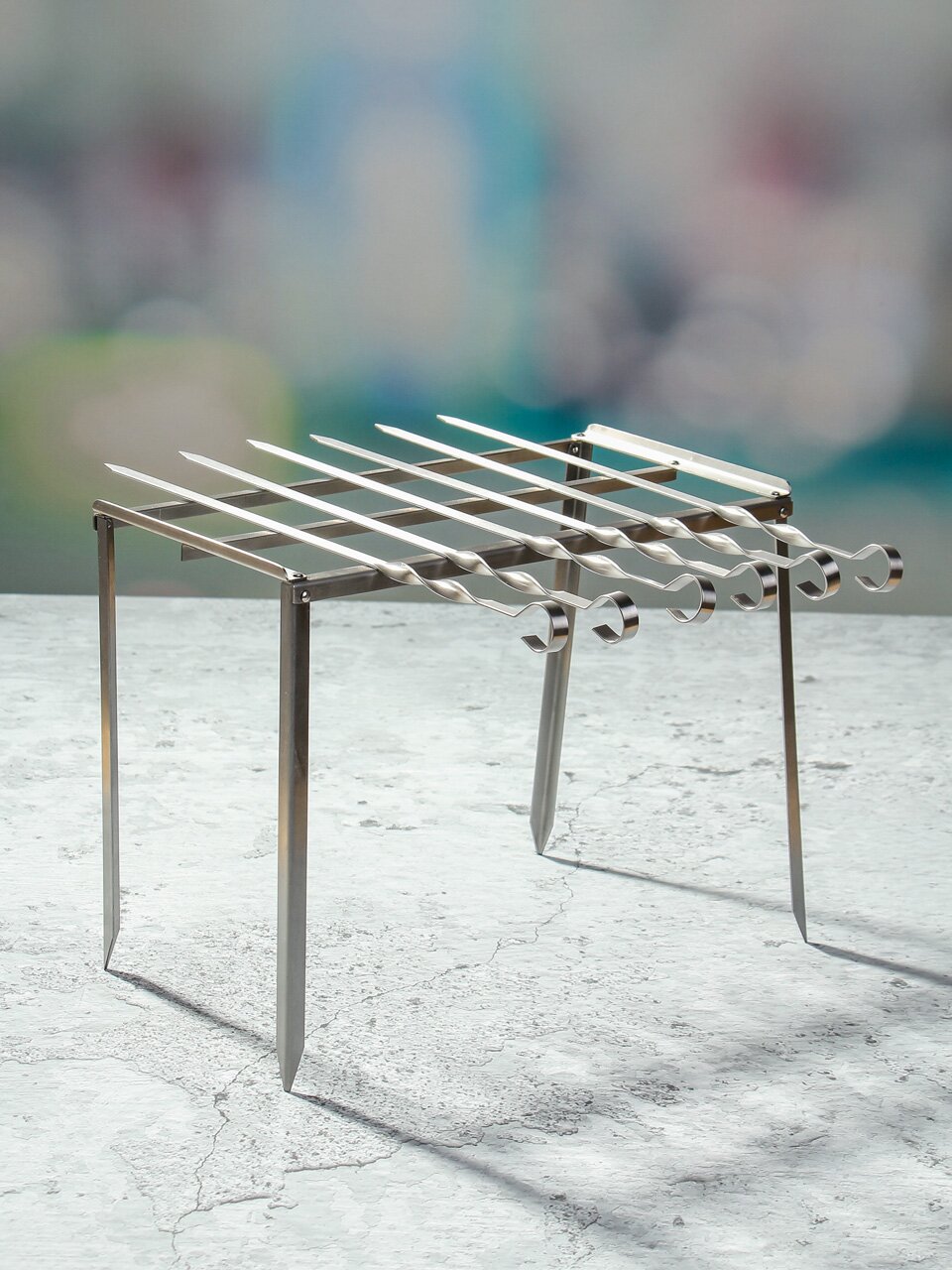 В комплекте 6 плоских шампуров из нержавеющей стали и стойка размером 360х180х270 мм для удобства приготовления и подачи.