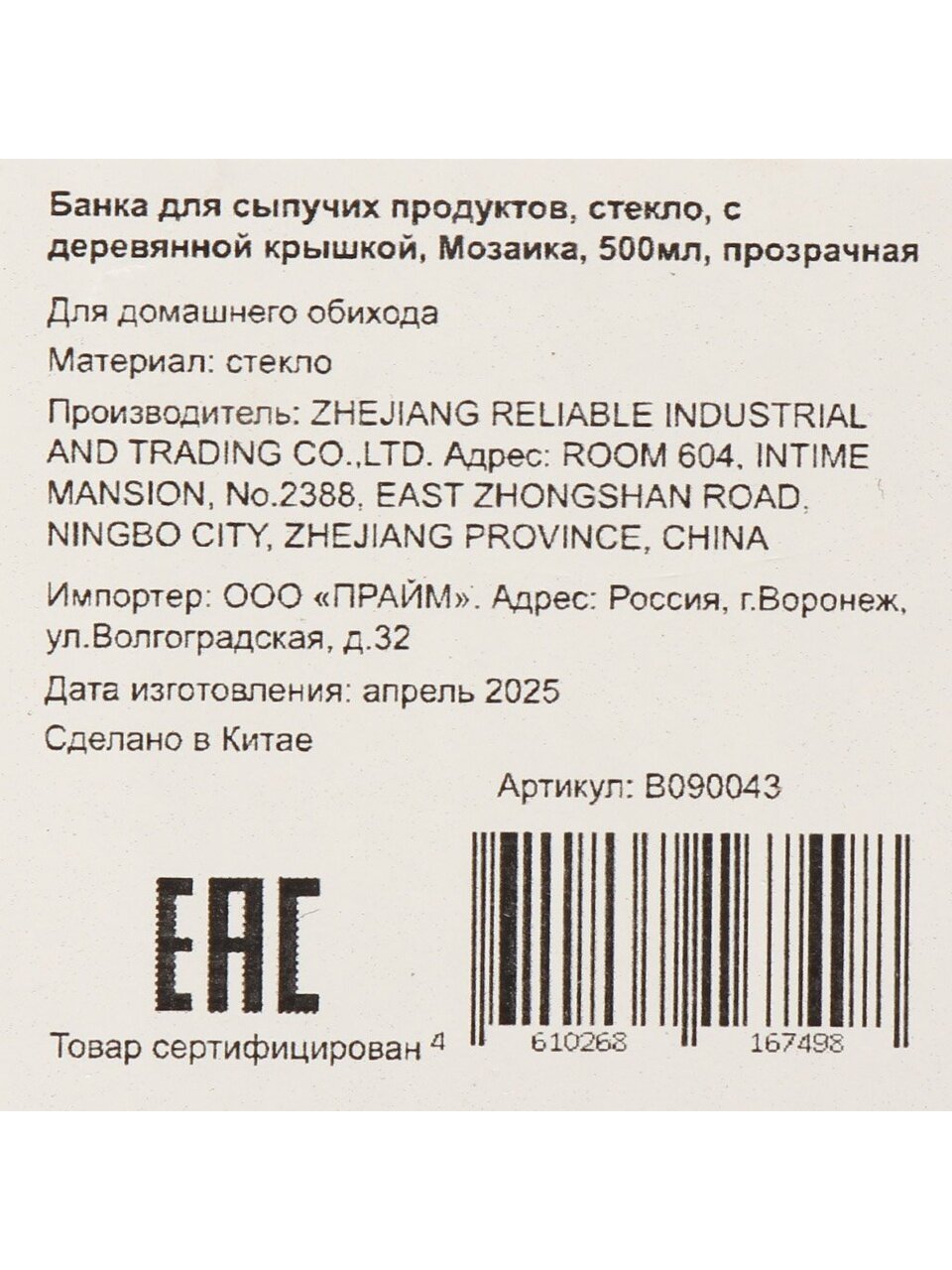 Идеальный выбор для хранения сыпучих продуктов — банка из прозрачного стекла объемом 0.5 л серии "Мозаика". Стильный рельефный дизайн украсит кухню, а герметичная деревянная крышка сохранит свежесть содержимого. Банка подходит для использования в СВЧ, удобна для хранения круп, сахара, соли и других продуктов. Покупка этой банки — это порядок и эстетика на кухне, а также долговечность хранения.