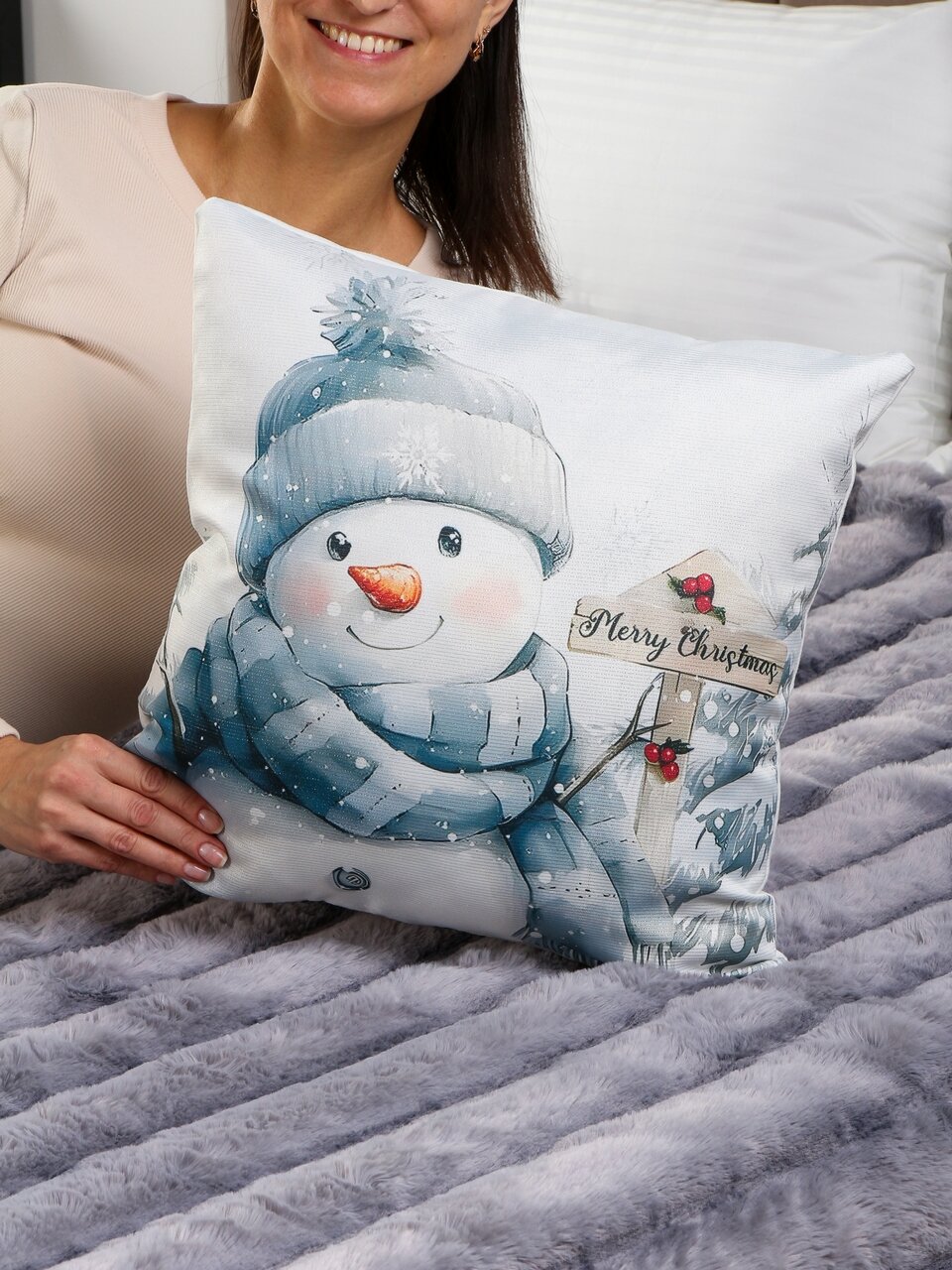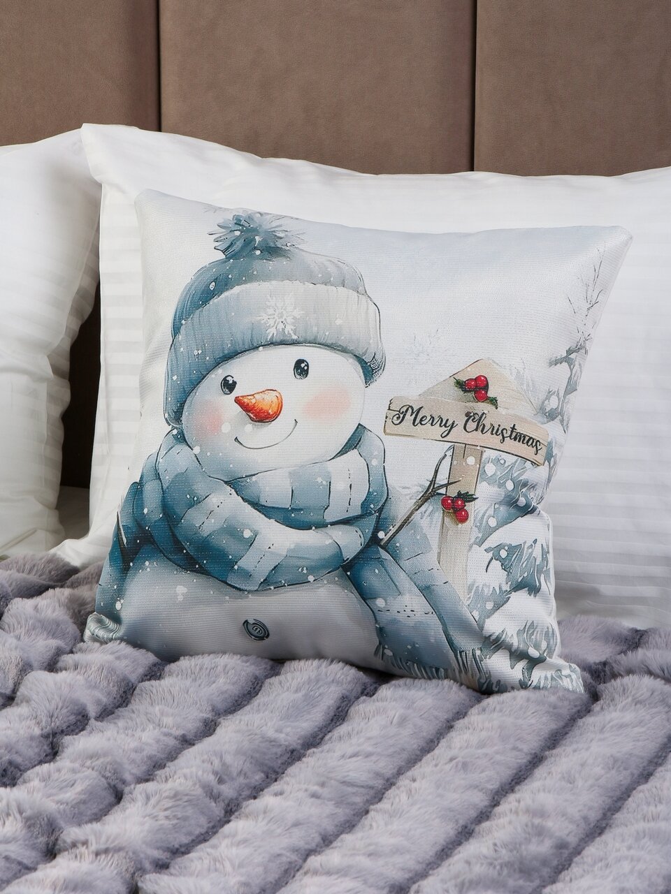 Декоративный чехол на подушку «Снеговик» — популярный выбор среди покупателей, которые ищут недорогой способ добавить праздничное настроение в интерьер. Благодаря плотному полиэстеру изделие сохраняет форму, не скатывается и легко очищается от загрязнений. Чехол оснащён прочной молнией, что упрощает уход и быструю смену декора.