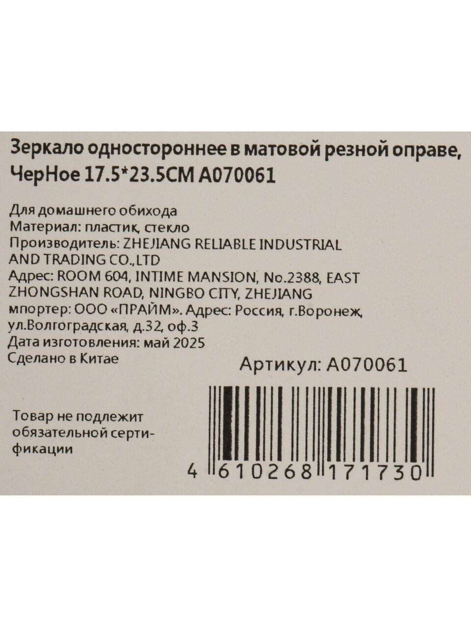 Тип — настольное, размер 17.5х23.5 см, форма прямоугольная, оправа матовая чёрная, материал — пластик, без увеличения, страна производства — Китай, артикул A070061.