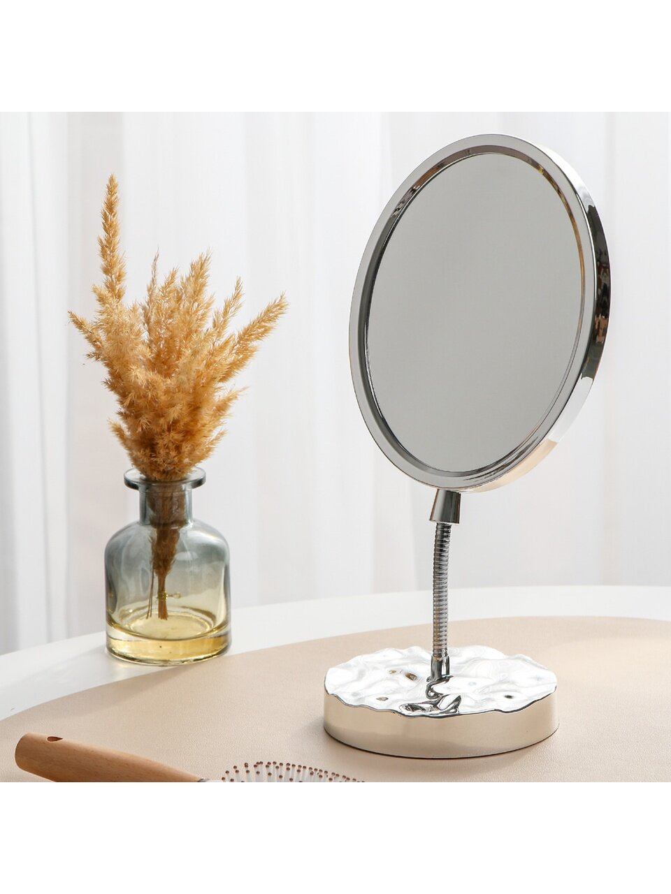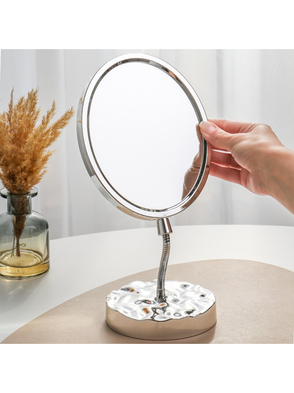Если вы ищете, как использовать настольное зеркало без увеличения, оно идеально подойдёт для утреннего ухода, бьюти-рутины, примерки аксессуаров или как элемент декора. По сравнению с аналогами из стекла, пластиковый корпус легче и безопаснее в быту.