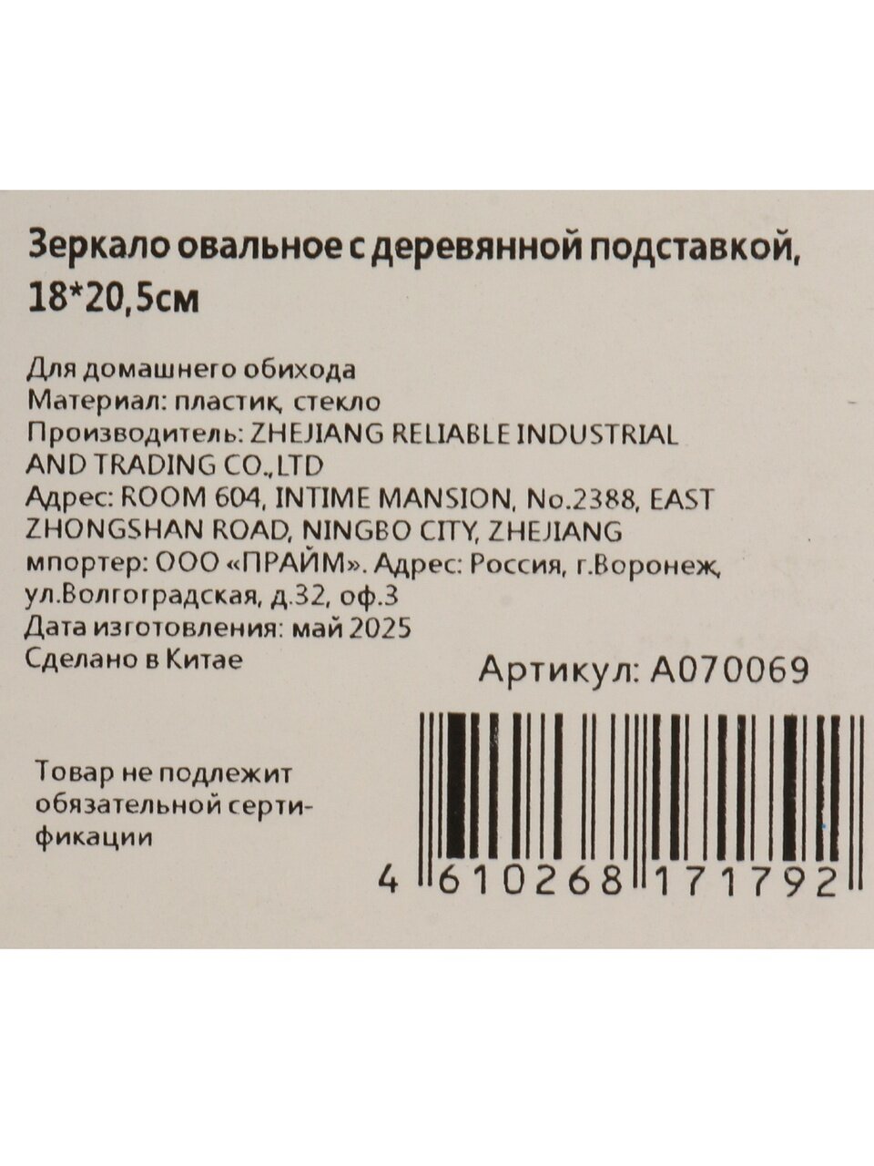 Зеркало выполнено из пластика и дерева, что обеспечивает прочность, устойчивость и долгий срок службы. Размер — 18х20.5 см, форма — овал.