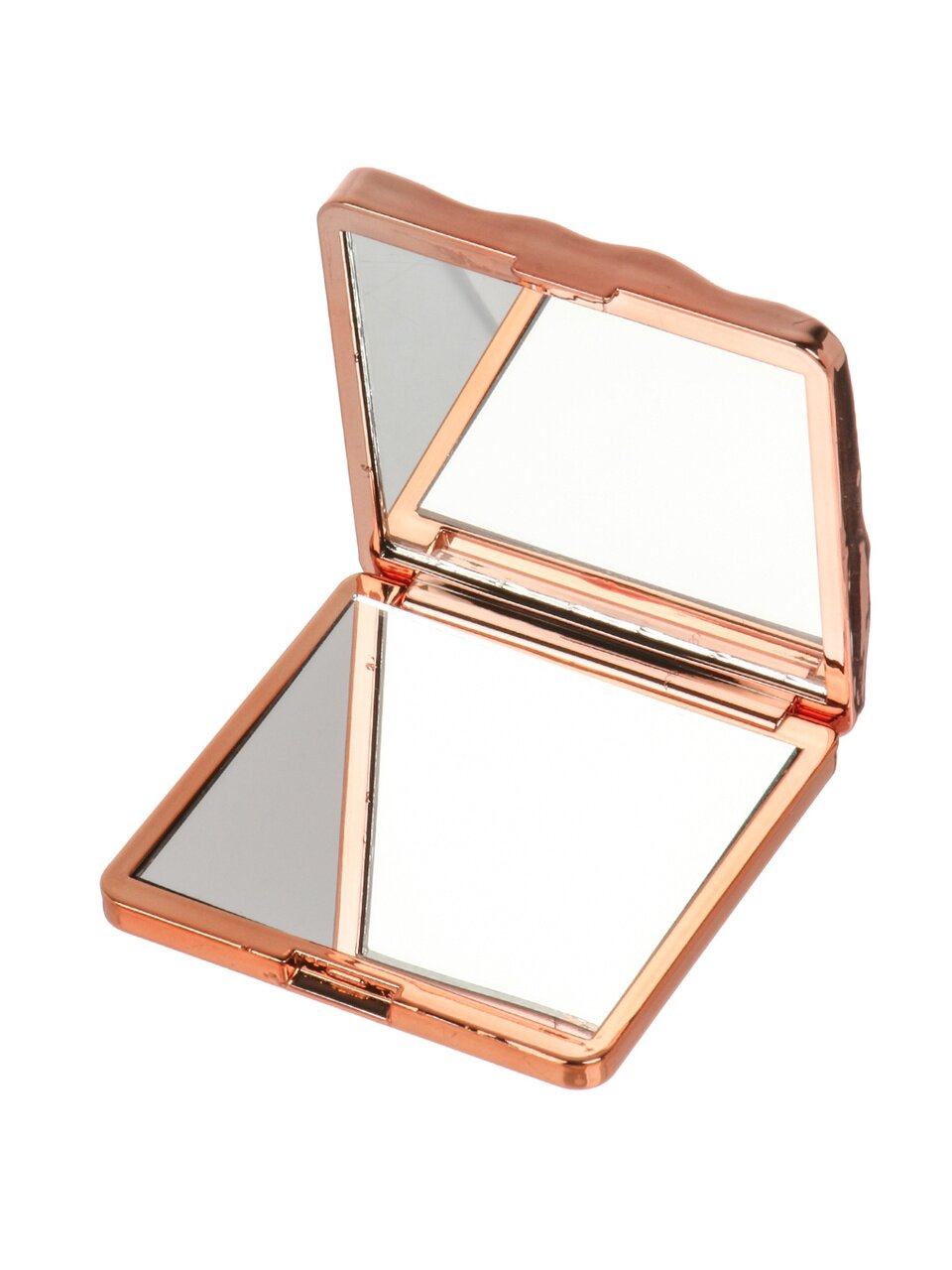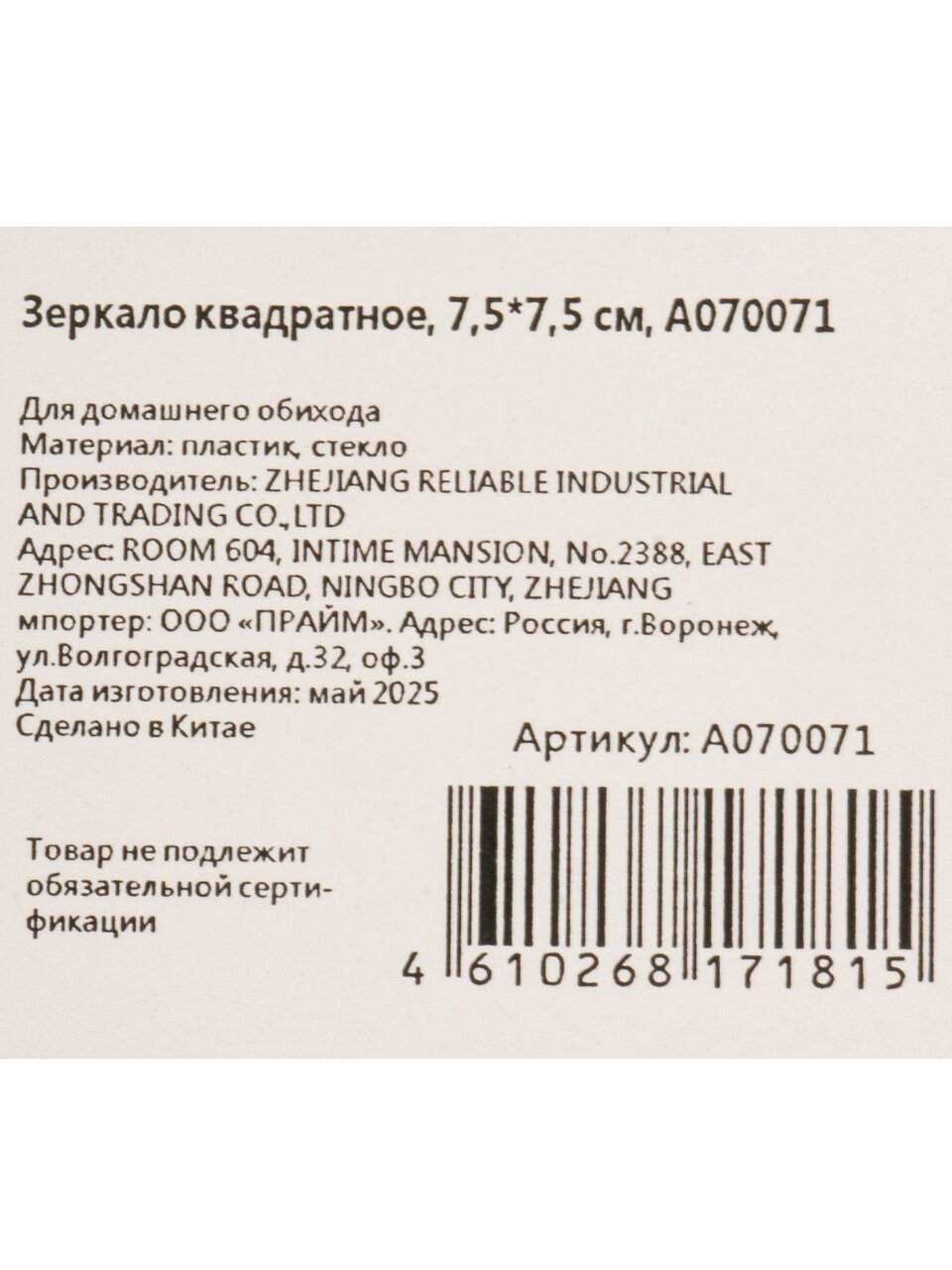 Карманное настольное зеркало 7.5х7.5 см выполнено из лёгкого пластика, не увеличивает изображение, легко помещается в сумку или косметичку и не боится ударов.