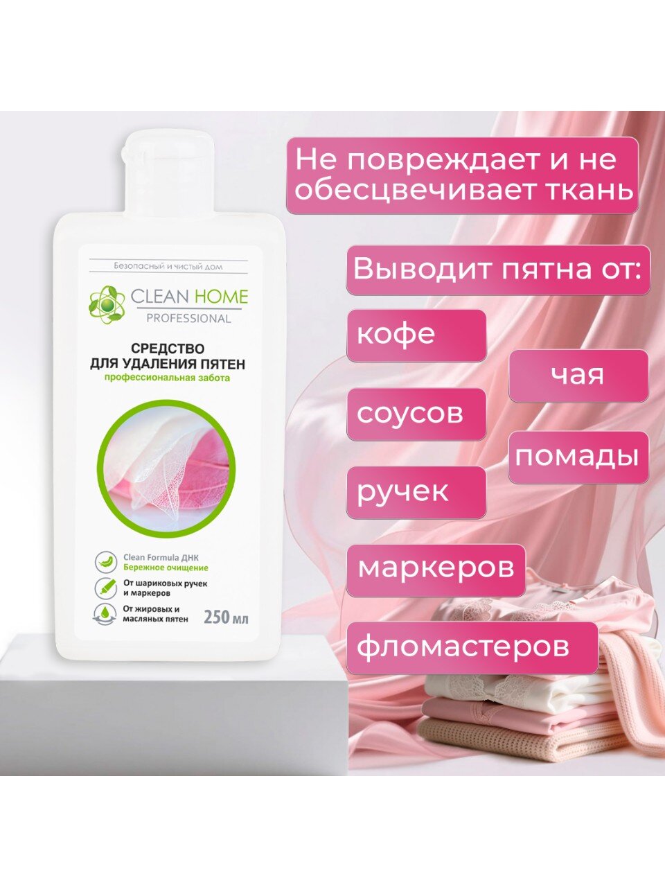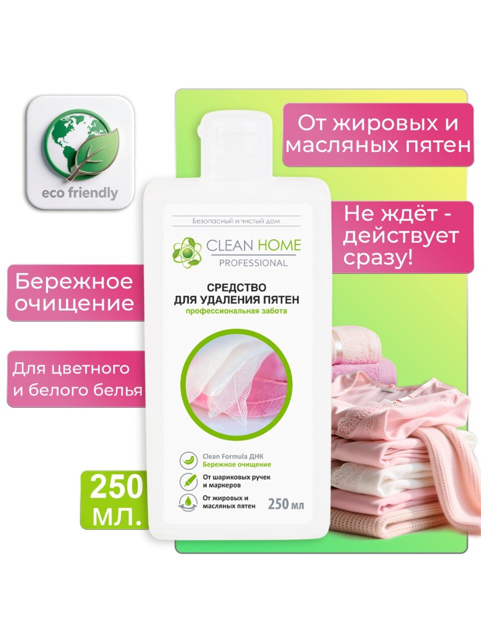 Пятновыводитель Clean Home Быстрое решение 250 мл — эффективное средство для удаления пятен с одежды и текстиля. Идеален для быстрой борьбы с загрязнениями в домашних условиях. Легко справляется с различными видами пятен, экономя время и силы.