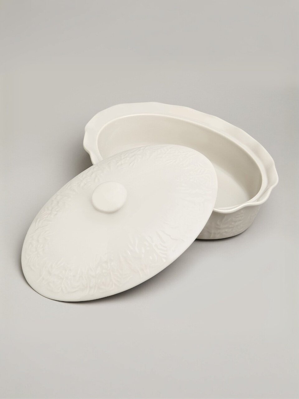 Размер: 24х33х13 см, объём — 2 литра. Овальная форма с крышкой, подходит для большинства духовок и СВЧ.