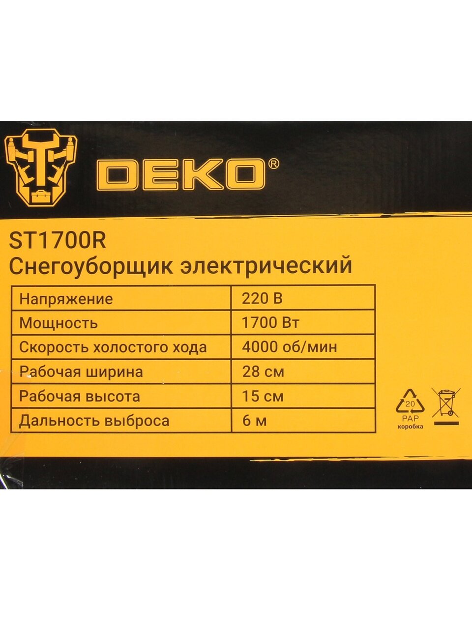 Покупая электрический снегоуборщик DEKO ST1700R с гарантией 12 месяцев, вы получаете надежный инструмент для быстрой уборки снега по выгодной цене. Оформите заказ сейчас — и забудьте о тяжелой ручной работе этой зимой.