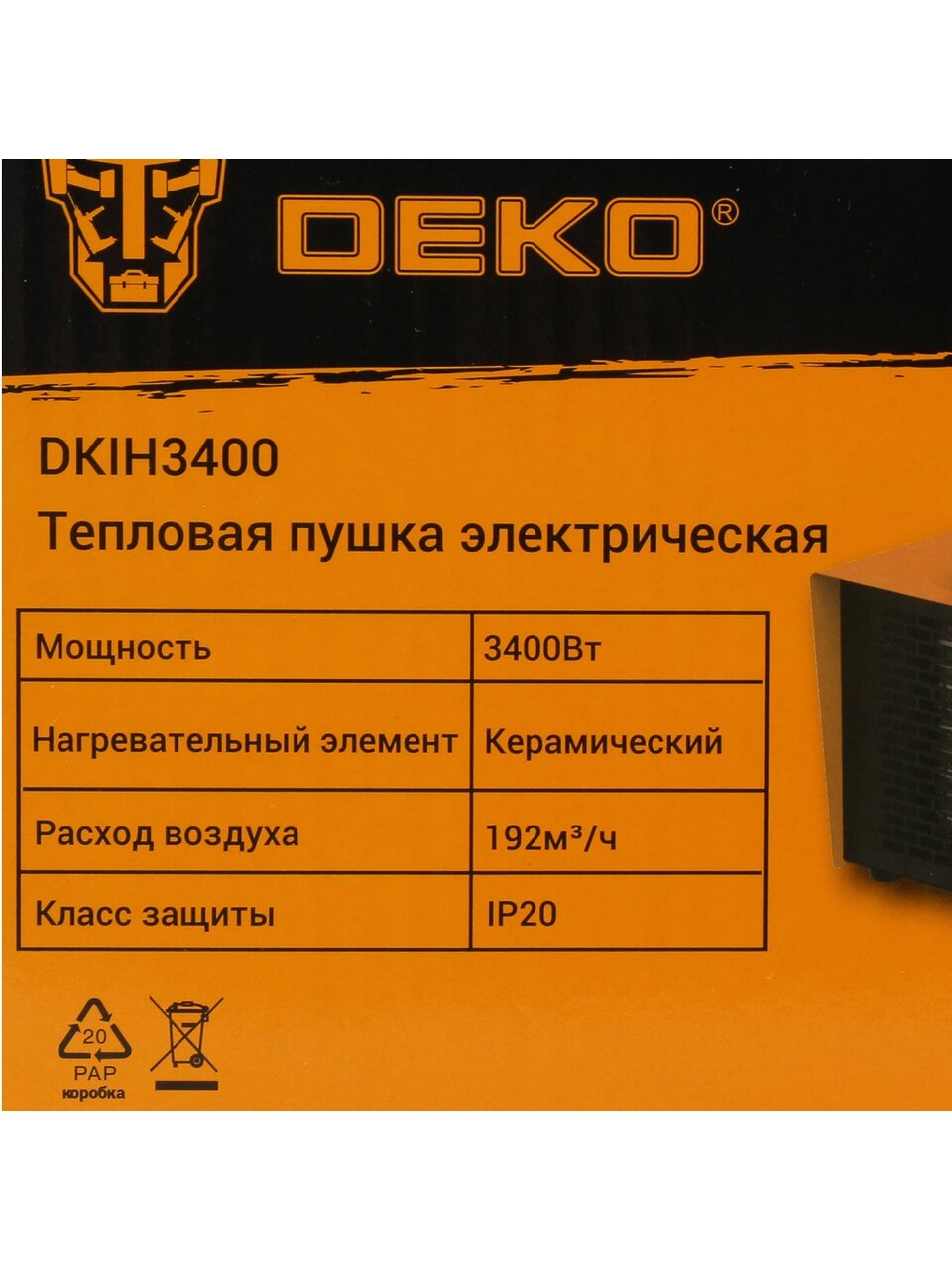 Электрическая тепловая пушка Deko DKIH3400 — быстрый и безопасный обогрев до 35 м², керамический элемент, мобильность для дома и дачи.