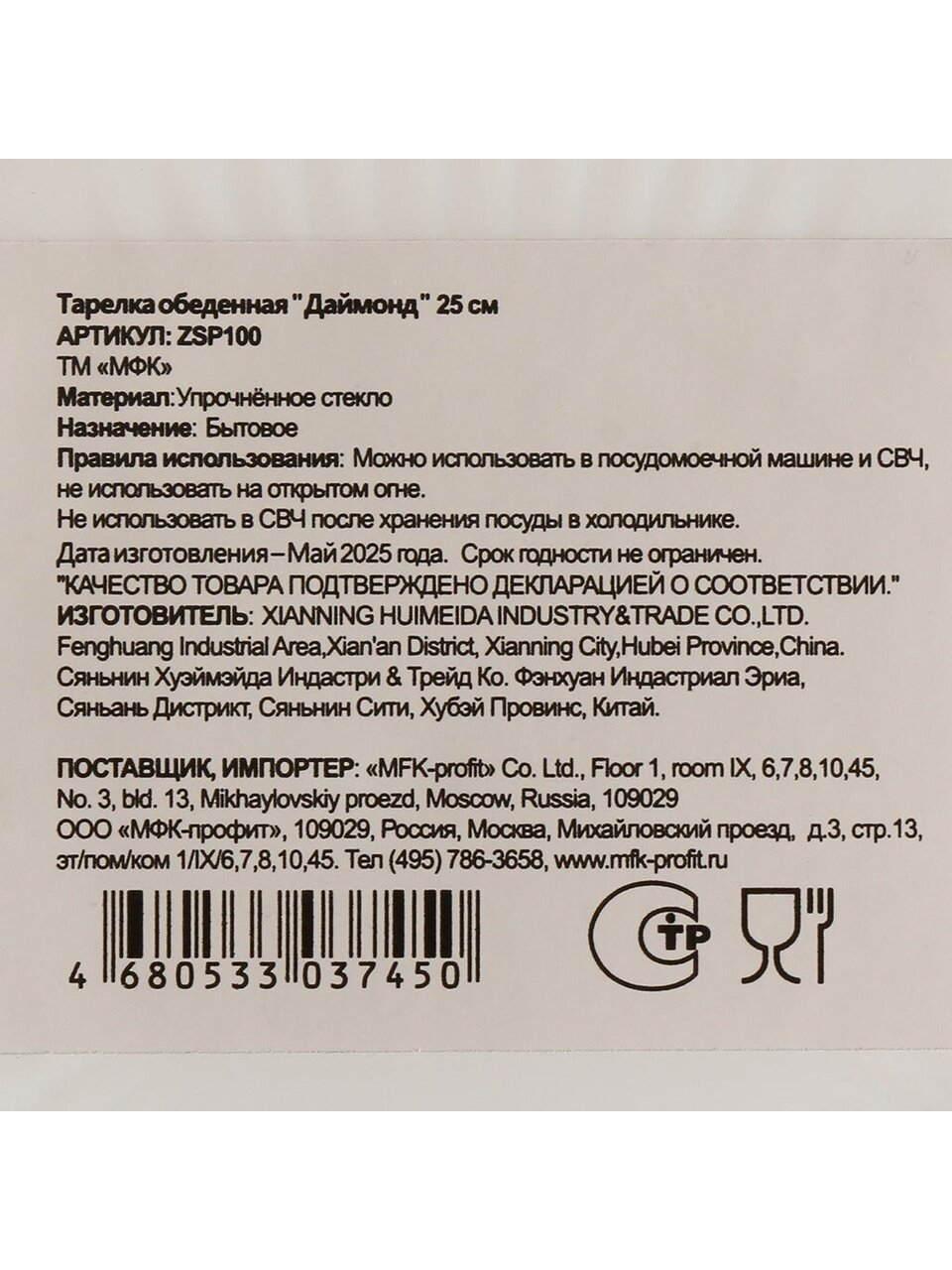Обеденная тарелка из стеклокерамики 25 см МФК Даймонд — стильное решение для сервировки, подходит для СВЧ и посудомоечной машины, выгодно для дома и дачи.