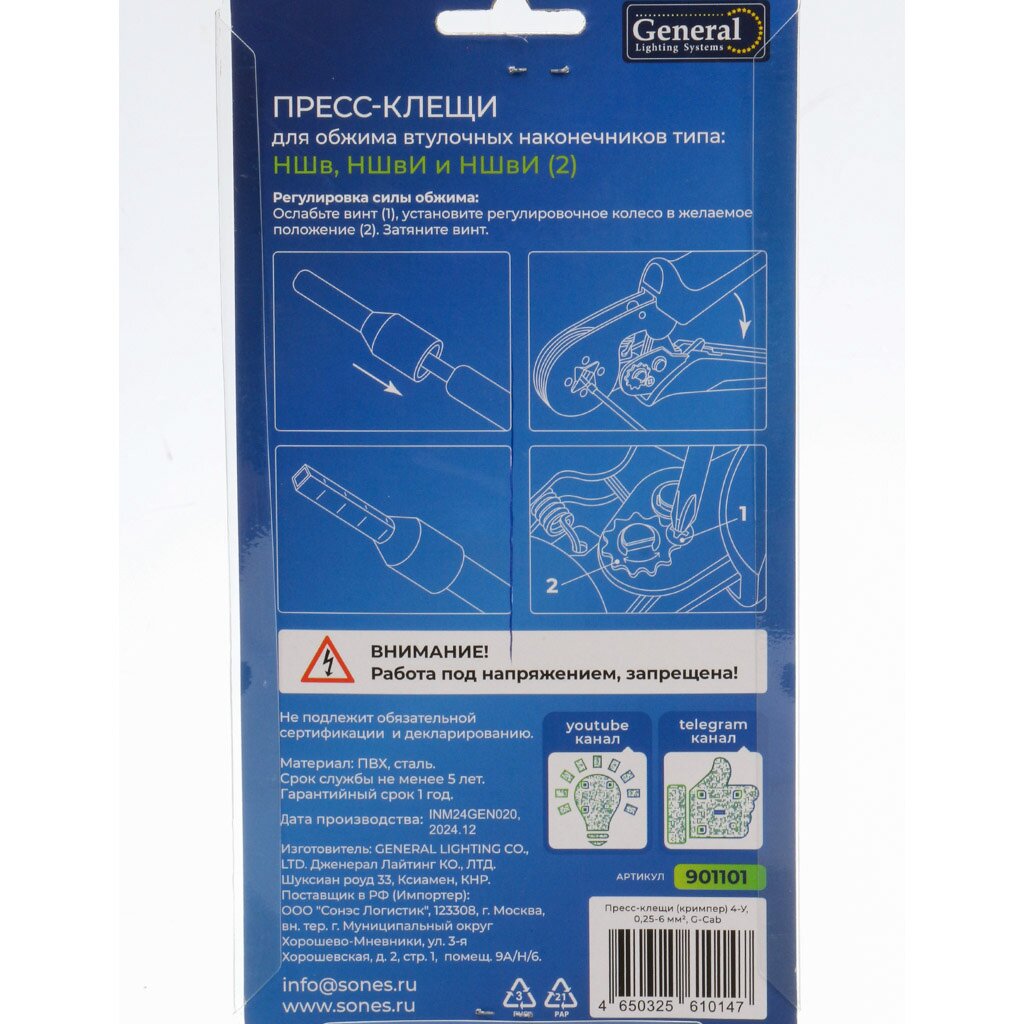 Пресс-клещи (кримпер) 4-У, G-Cab позволяют быстро и качественно выполнять обжим кабельных наконечников и контактных групп. Благодаря диапазону диаметров 0,25-6 мм², этот инструмент подходит для большинства стандартных электромонтажных работ — от ремонта электропроводки в квартире до сборки распределительных щитов на даче. Если вы ищете, какой кримпер выбрать для домашних задач, обратите внимание на прочность механизма, эргономику и совместимость с нужными сечениями — все эти параметры реализованы в модели General Lighting Systems.