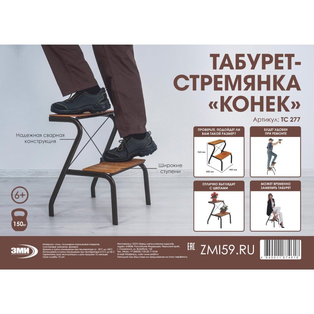 Табурет-стремянка ЗМИ ТС 277 КОР: выдержит до 300 кг, компактный размер 560х430 мм, идеален для дома и дачи — надежность на годы.