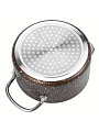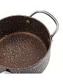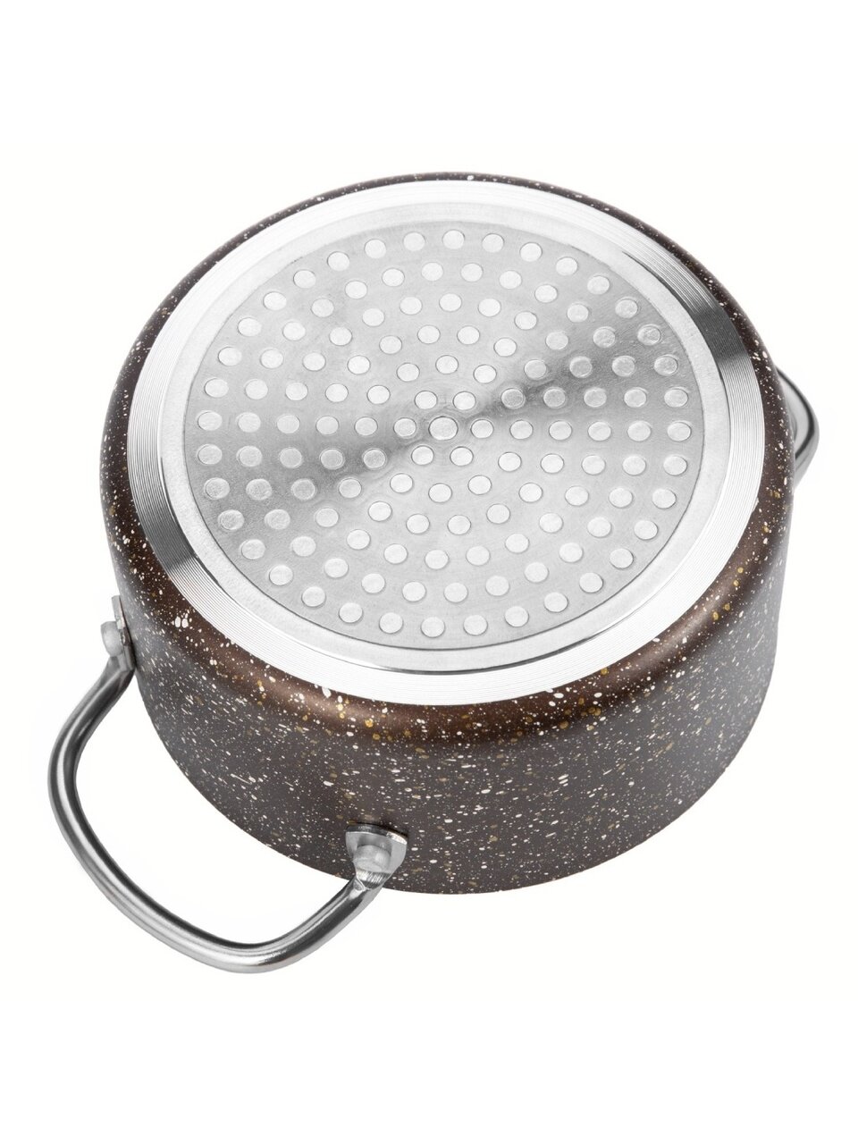 Корпус из прочного алюминия с антипригарным покрытием «коричневый мрамор», крышка из закалённого стекла. Срок службы при правильном уходе — до 5 лет.